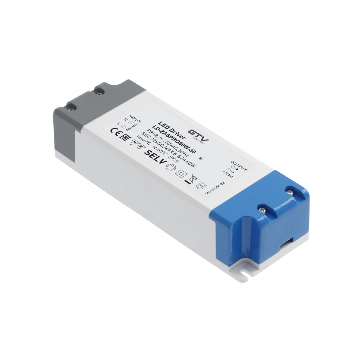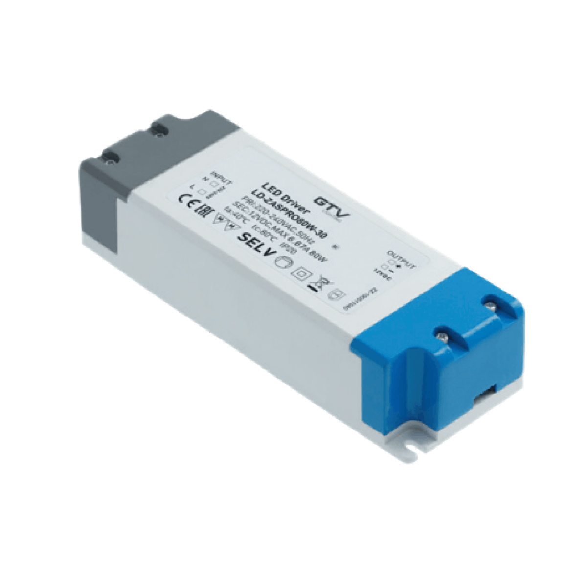 Блок живлення LED PRO 12 В, 80 Вт, вхід 220-240 В змінного струму, IP20, розміри 181x63x40 мм Блок живлення знижує вхідну напругу мережі з 220-230 В до 12 В. Це означає, що його можна використовувати для живлення більшості світлодіодних меблевих світильників. Блок живлення GTV LED має захист від короткого замикання й перевантаження, що підвищує безпеку його використання. Характерною особливістю блоків живлення серії PRO від GTV є вбудований фільтр ЕМС, що усуває подразнювальний скрип. Захист від перевантаження встановлений на такому рівні, що в разі виникнення надзвичайної ситуації джерело живлення просто вимкнеться, а не перегорить. Максимальна робоча температура для блоків живлення PRO становить 80 °C. Завдяки цьому їх можна використовувати на меблях і деревних матеріалах.