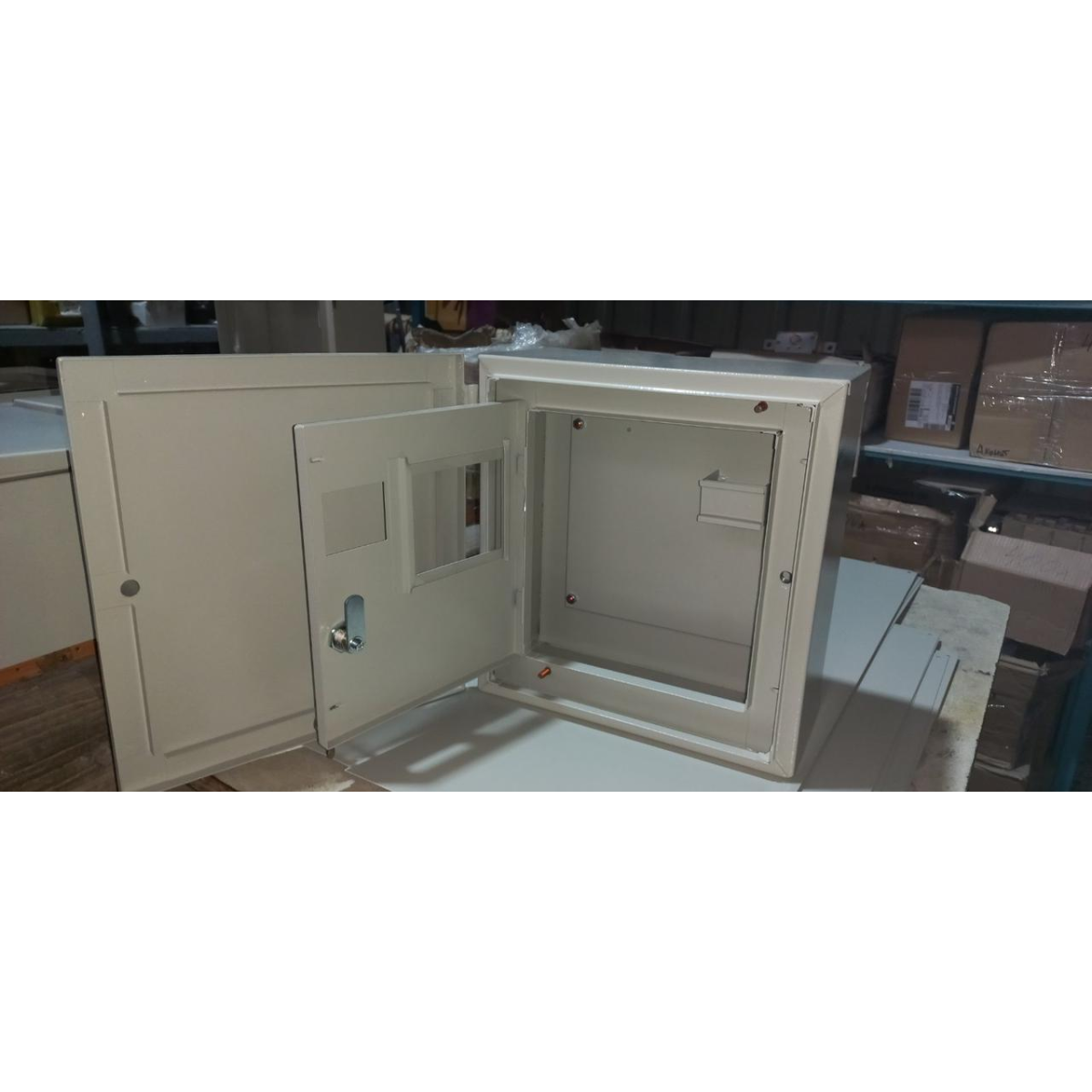 ЩИТ ОБЛІКОВО-РОЗПОДІЛЬЧИЙ ЩУРН-1-3 (НАКЛАДНИЙ IP54 АНТИВАНДАЛЬНИЙ) ЩРА-1-3 Щит ЩУРН-1/3 (ЩРА-1-3) дводверний (антивандальний) герметичний IP54 використовуються для встановлення на вулиці. Використовуються для встановлення однофазного лічильника, (автоматичних вимикачів до 3 модулів) і випробувальної колодки. Для зняття показань лічильника в щиті ЩУРН є оглядове вікно. Також у щиті передбачене пломбування введеного автомата та лічильника. Основні характеристики: Габарити корпусу (В*Ш*Г): 310 х 290 х 140 мм Товщина металу корпусу: 1,5мм Замок: зовнішні двері — гвинтовий замок; внутрішні двері — із замком під ключ Ступінь захисту: IP54 Конструкція: суцільна, зварна Колір покриття: RAL7032 з поверхневою структурою «шагрень» Виконування: навісний