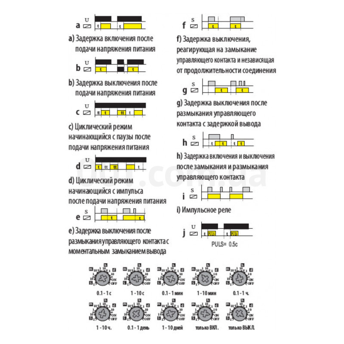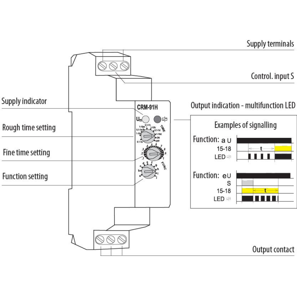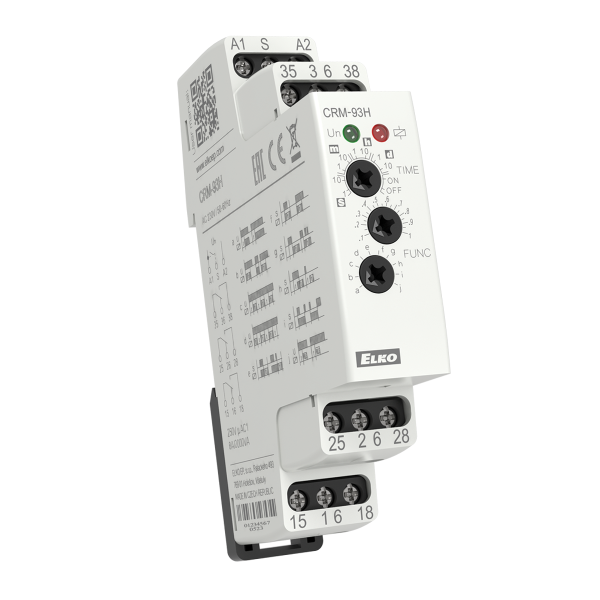 Мультифункціональне реле часу CRM-93H UNI 2470002 Багатофункціональне реле часу Elko Ep ETI CRM-93H UNI з універсальною котушкою керування: 12 - 240 AC/DC 2470002 Універсальне реле часу Elko Ep ETI CRM-93H/UNI для використання в автоматизації, керуванні, регулюванні та в домашніх електросистемах. Завдяки найчастіше використовуваним функціям і широкому тимчасовому діапазону дає змогу використовувати його в будь-яких електросистемах. ОПИС CRM-93H: багатофункціональне реле часу для універсального використання в системах автоматизації, керування й регулювання або в домашніх системах напруга живлення: 12 - 240 AC/DC зручне та наочне настроювання функцій і тимчасових діапазонів здійснюється поворотними перемикачами настроюваний час від 0.1 від до 10 днів розділений на 10 діапазонів: (0.1 с — 1 с / 1 с — 10 с / 0.1 хв — 1 хв / 1 хв — 10 хв / 0.1 год — 1 год / 1 год / 0.1 дня — 1 день / 1 день — 10 днів / лише ON / тільки OFF) вихідний контакт: CRM-93H: 3x перемикальний 16 A мультифункціональний червоний світлодіод блимає або світиться залежно від робочого стану ТЕХНІЧНІ ПАРАМЕТРИ CRM-93H: Напруга живлення 12 - 240 AC/DC. 0.1 с — 10 днів розділений на 10 тимчасових діапазонів. Вихідний контакт: 3x перемик 8 A (AgNi) Індикація виходу: мультифункціон. червоний LED Кріплення: DIN рейка EN 60715 Захист: IP40 з боку лицьової панелі/IP20 клемами Розмір: 90 x 17.6 x 64 мм Вага: UNI - 62 Гр.; 230V - 57 Гр