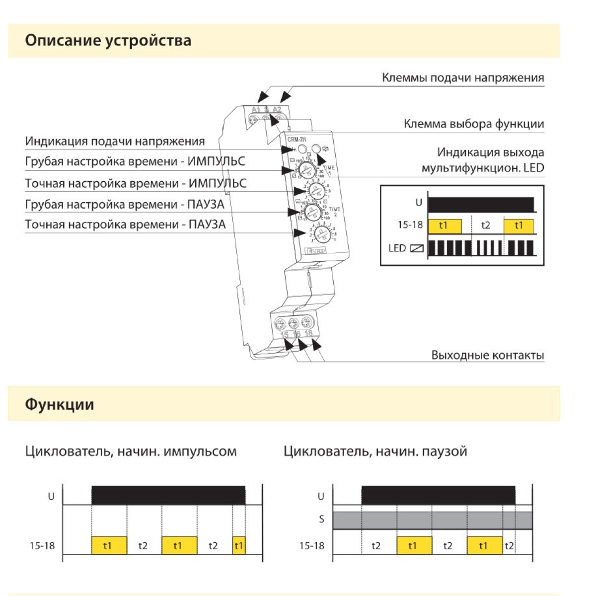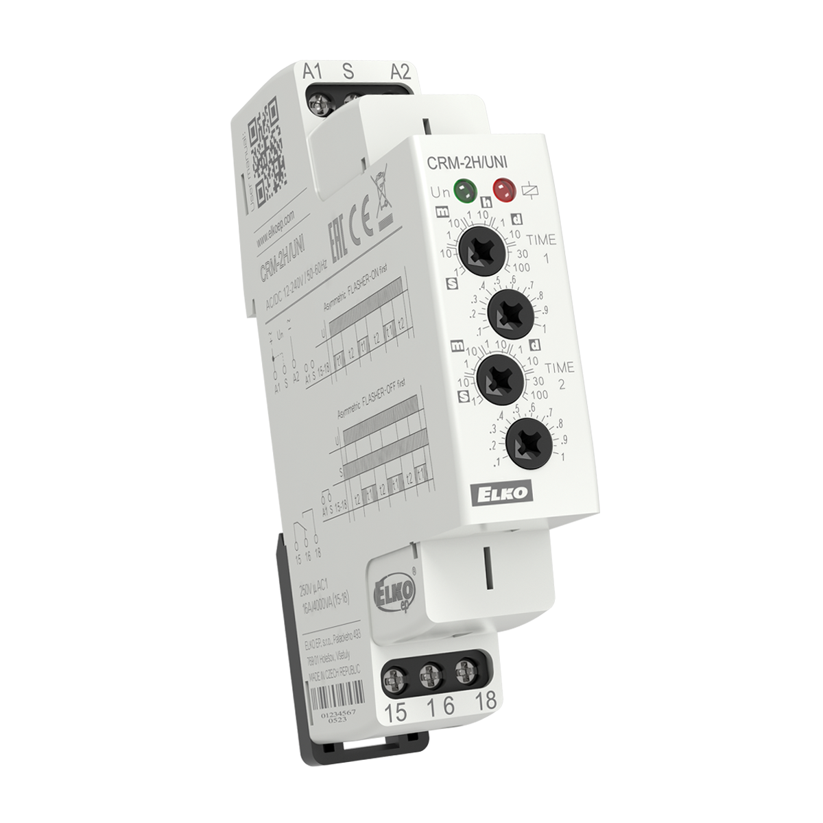 Реле часу (Асиметричний циклівник) CRM-2H 230V 2470088 Асиметричний циклівник (реле часу циклічне) Elko Ep ETI CRM-2H 230V з котушкою керування: 230 AC/DC 2470088 Асиметричний циклівник Elko Ep ETI CRM-2H 230V для керування світловою сигналізацією, опаленням, електромоторами, вентиляторами з незалежним настроюванням часу увімкнення та вимкнення виходу. Завдяки найчастіше використовуваним функціям і широкому тимчасовому діапазону дає змогу використовувати його в будь-яких електросистемах. ОПИС CRM-2H: Використовується для регулярної вентиляції приміщень, осушення й зрошення за допомогою електромагнітного клапана, періодичного зниження вологості, циклічного керування освітленням, циркуляційними насосами, світловими вивісками, що запобігають пристроям, світловими сигналами та пр. 2 функції: цикл імпульсу, що починається з імпульсу, цикл цикл, що починається з пробілу. ТЕХНІЧНІ ПАРАМЕТРИ CRM-2H: Напруга живлення: AC 230 V. Макс. втрачає потужність (Un + клеми): 4 W Кількість контактів: 1x перемикальний 16A (AgNi) Кріплення: DIN рейка EN 60715 Світлодіодна індикація: вхід - зелений, вихід - червоний Захист: IP40 з боку лицьової панелі/IP20 клеми Розмір: 90 x 17.6 x 64 мм Вага: (UNI) - 63 Гр., (230) - 61 Гр.