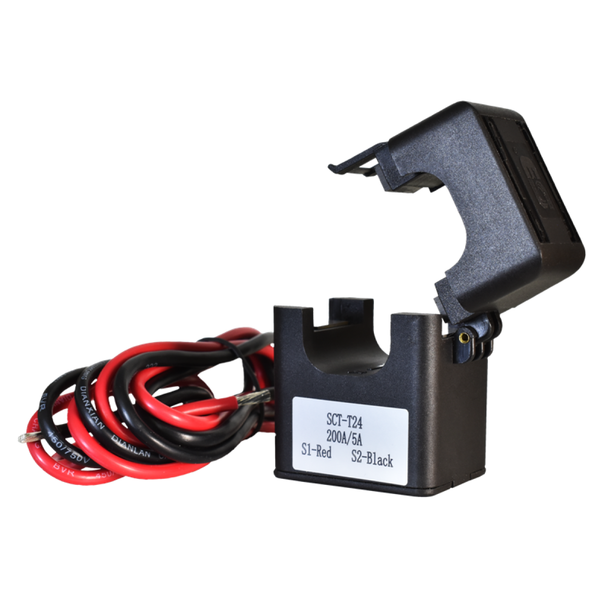 Роз“ємний вимірювальний трансформатор струму (кліпса) для швидкого і зручного монтажу. Номінал: 200/5 Номінальний вторинний струм: 5А Внутрішній діаметр отвору для кабелю — 24 мм