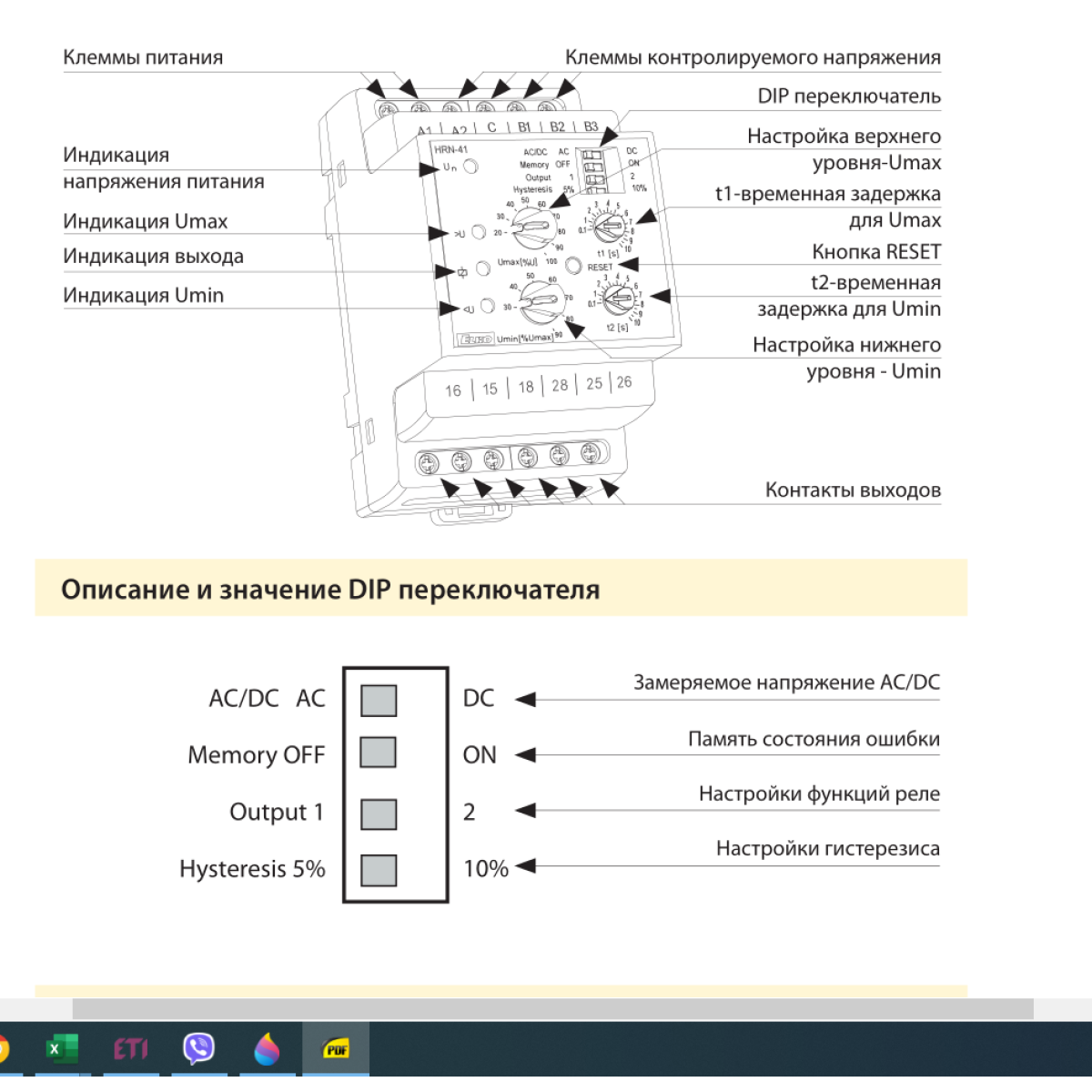 Реле напруги ELKO EP HRN-42 24V AC/DC Універсальне реле контролю напруги HRN-42 виробництва ELKO EP (Чехія) для однофазних мереж AC/DC в 3 диапазонах от 10 до 500V AC/DC Реле контроля HRN-42 призначений для захисту від підвищеної та зниженої напруги в однофазних мережах як змінного, так і постійно струму в діапазонах: AC/DC 10 - 50 V; AC/DC 32 - 160 V; AC/DC 100 — 500 V. Вибір контрольованої напруги відбувається під“єднанням до відповідних клем ХАРАКТЕРИСТИКИ реле контролює напругу на двох незалежних рівнях (Umin, Umax) настроювання контролю рівня Umax — 20.100 % от диапазона настроювання контролю рівня Umin (у % від діапазону - функція ОКНО) настроювана функція “ПАМ“ЯТЬ“ функція другого реле (незалежно/ паралельно) настроювання затримок 0,1.10с для усунення коротких випадків напруги та піків незалежно для кожного рівня гальванічно ізольоване харчування від регулювальних входів вихідний контакт 2x перемик. 16 A / 250 V AC1 для кожного контрольованого рівня напруги у виконанні 3-МоДУЛЯ, кріплення на DIN рейку ТЕХНІЧНІ ПАРАМЕТРИ Напруга живлення для 4 модифікацій реле: 1) AC 110 V; 2) AC 230 V; 3)AC 400 V; 4) AC/DC 24 V (AC 50-60 Гц) Потужність макс.: 5 VA / 2.5 W (AC 110 V, AC 230 V, AC 400 V), 2 VA / 2.5 W (AC/DC 24 V) Кількість контактів: 2x перемикальний 16 A (AgNi) Кріплення: DIN рейка EN 60715 Захист: IP40 з боку лицьової панелі/IP20 клеми Розмір: 90 x 52 x 65 мм Вага: 249 Гр. (110V, 230 V, 400 V), 146 Гр. (24 V)