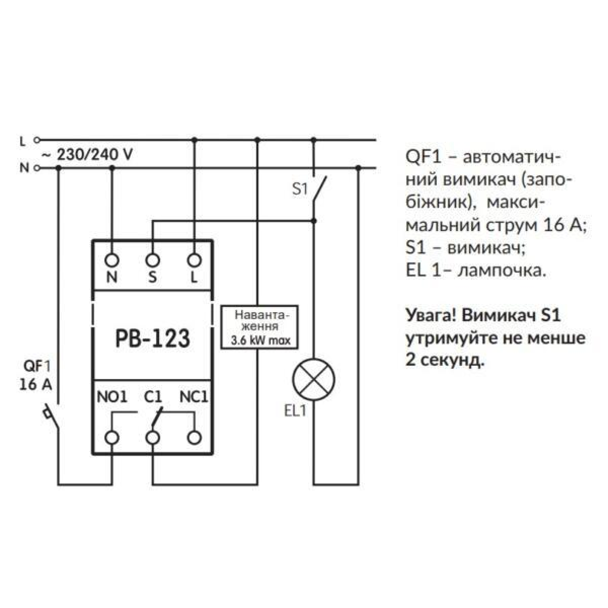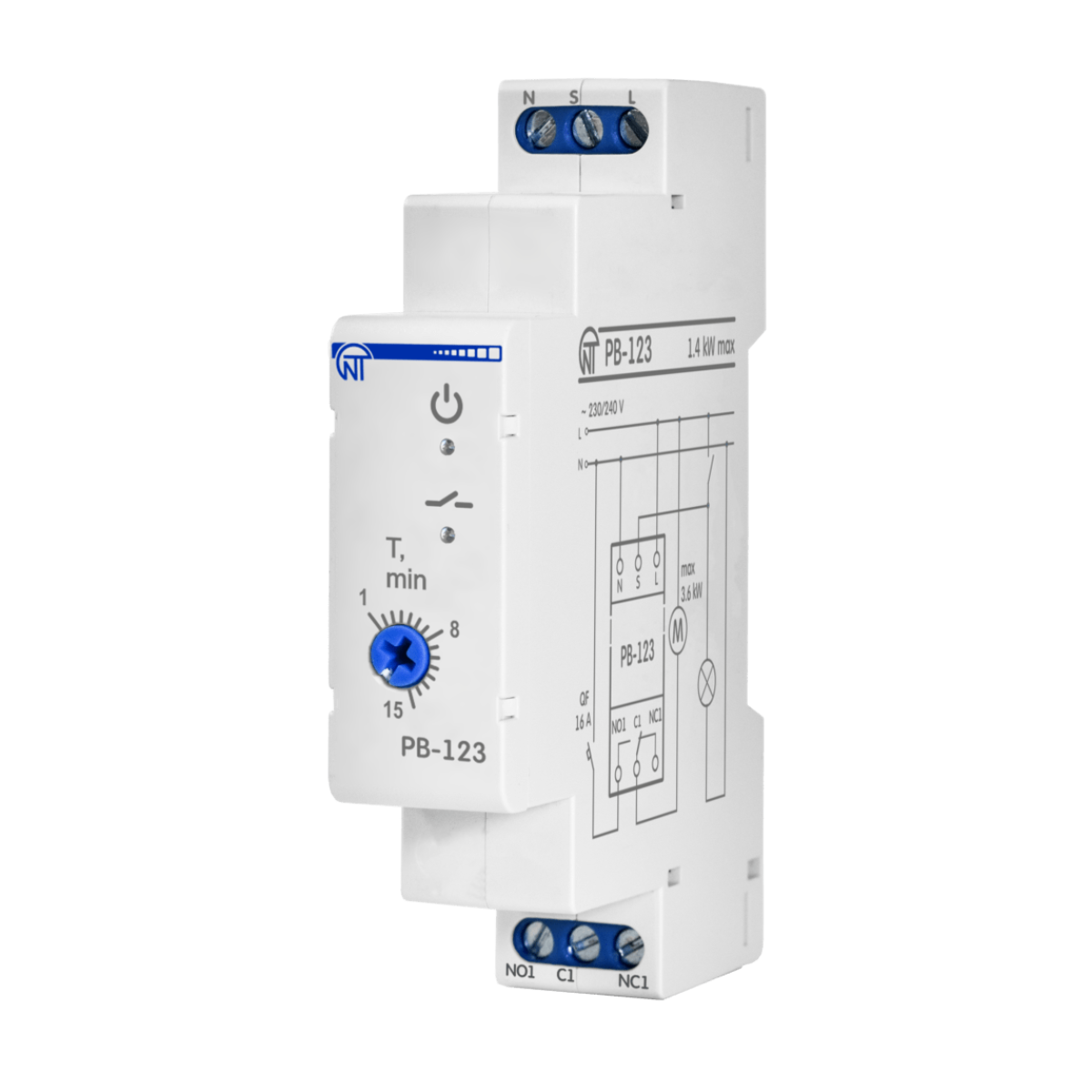 Реле часу РВ-123 призначене для відключення навантаження (вентилятора) після розмикання контактів вимикача протягом встановленого користувачем проміжку часу. Наприклад, у вентиляційних системах, санвузлах тощо. Вимикачем вмикаємо освітлення. Вентилятор увімкнеться. Після вимкнення освітлення навантаження (вентилятор) відключиться через встановлений проміжок часу. Витримка часу від 1 до 15 хв.