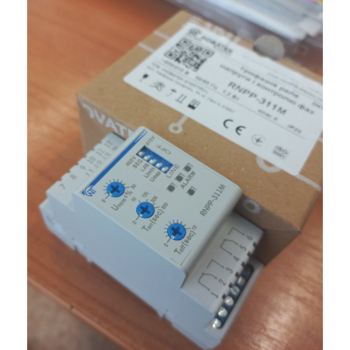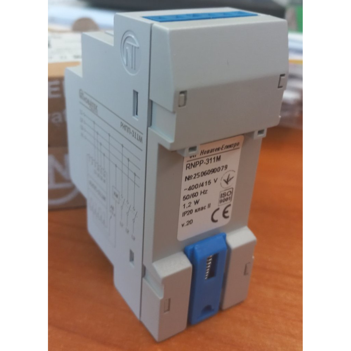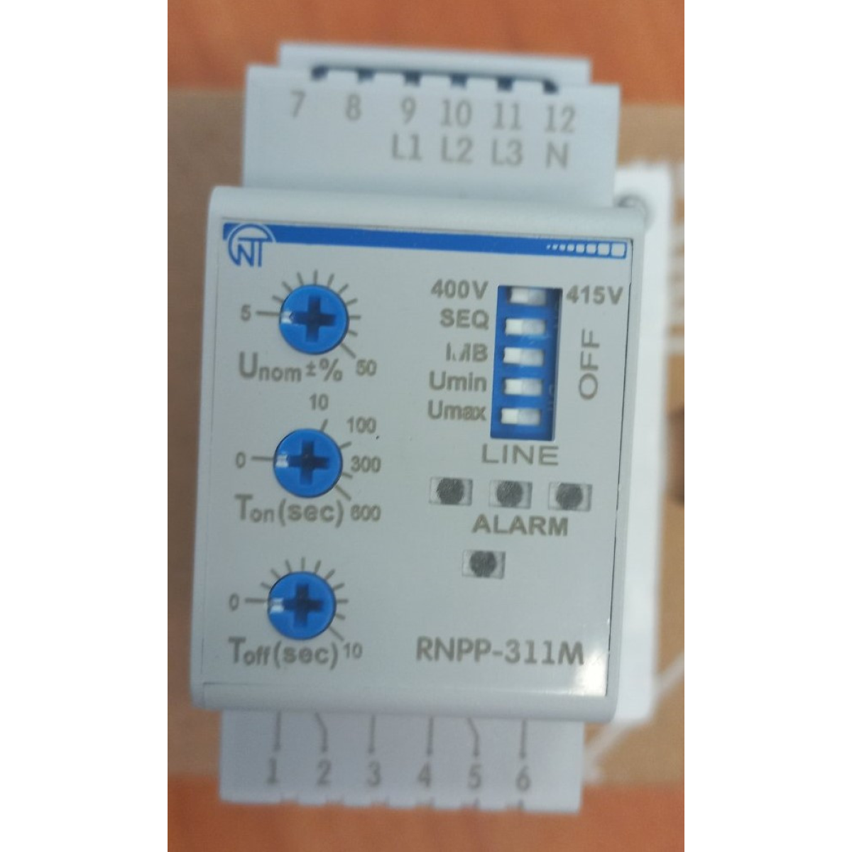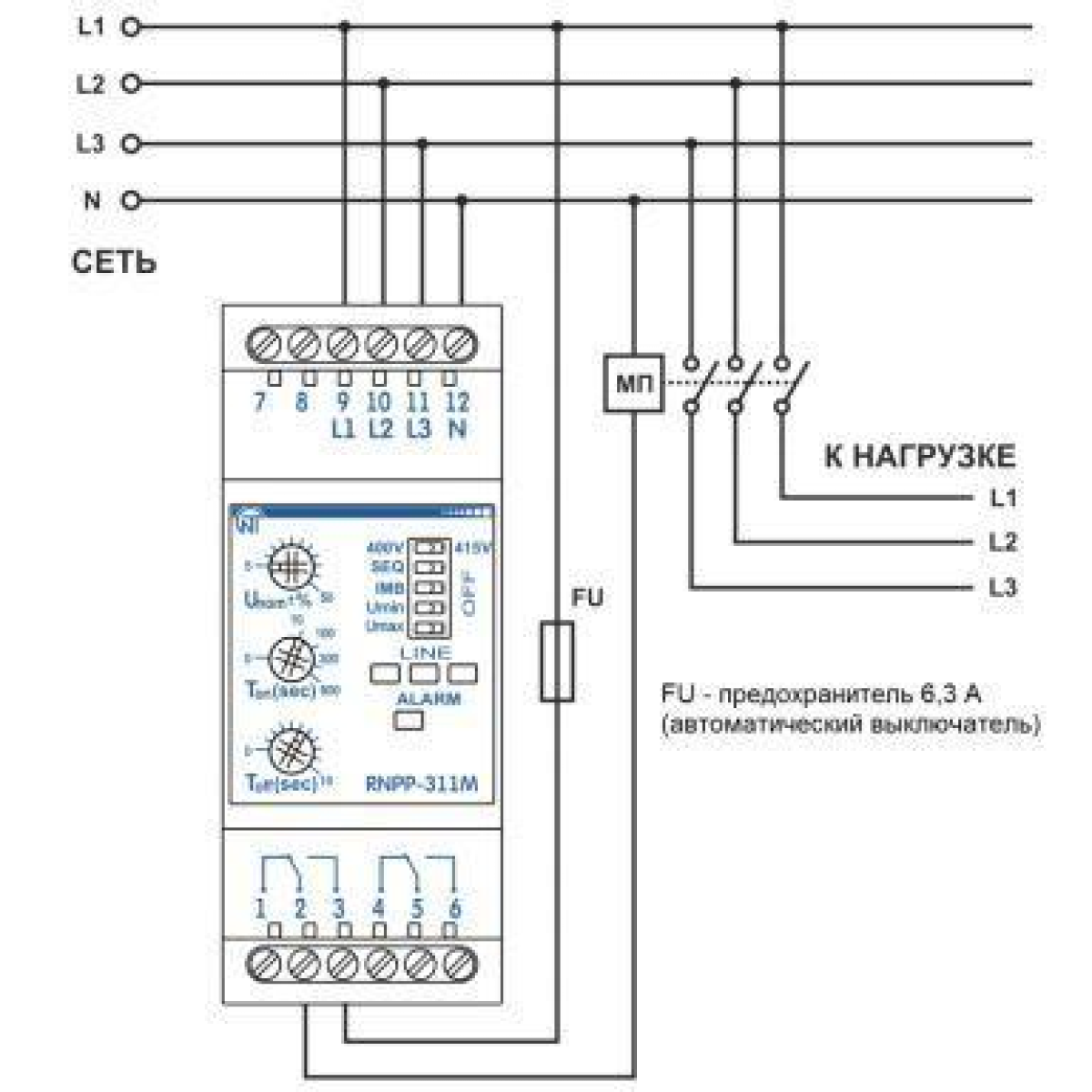 Реле напруги РНПП-311М призначене для захисту трифазних споживачів від основних видів аварії в електричній мережі, таких як: вихід діючого значення напруги за межі допустимоых порогів; порушення чергування і злипання фаз; порушення полнофазности і симетричності мережевої напруги. Пристрій контролює основні параметри електричної мережі і при їх відхиленні відключає навантаження. Світлодіоди на лицьовій панелі реле индицируют: наявність напруги в мережі; стан навантаження (включена або відключена); вид виникла аварії. Регулювальні потенціометри дозволяють користувачеві встановити: поріг мінімально/максимально допустимого значення напруги (у відсотках від номінального напруги); затримку часу включення навантаження після відновлення параметрів мережі; час спрацьовування відключення навантаження при всіх видах аварій мережевої напруги. За допомогою перемикачів на лицьовій панелі пристрою користувач може вибрати тип контрольованої мережі 380 / 400В, а також включити або відключити контроль наступних параметрів мережі: чергування і злипання фаз; полнофазности і симетричності мережевої напруги; пониженния напруги; повышенния напруги. Відповідні комбінації положення перемикачів дозволяють РНПП-311М працювати в різних режимах, як: режим повного контролю напруги мережі; режим контролю мінімального/максимального напруги; режим контролю мінімальної напруги; режим контролю максимального напруги; режим контролю наявності фаз; режим контролю неправильного чергування і наявності злипання фаз; режим контролю перекосу фаз, і в інших режимах. Контроль наявності фаз зберігається при будь-якому положенні перемикачів у тому числі, коли вони знаходяться в положенні ВИКЛ. Передбачена можливість підключення оперативного живлення 24В (під замовлення).