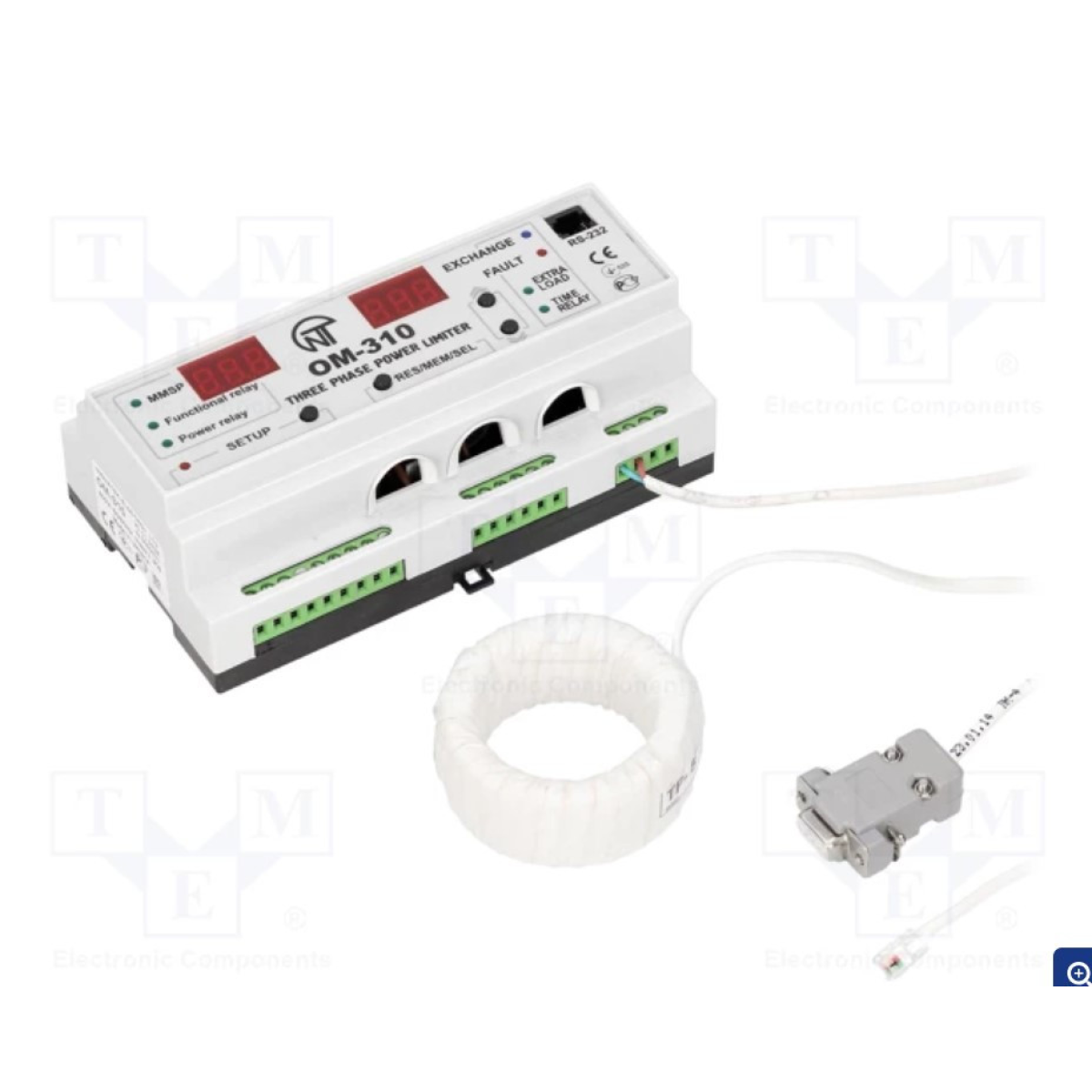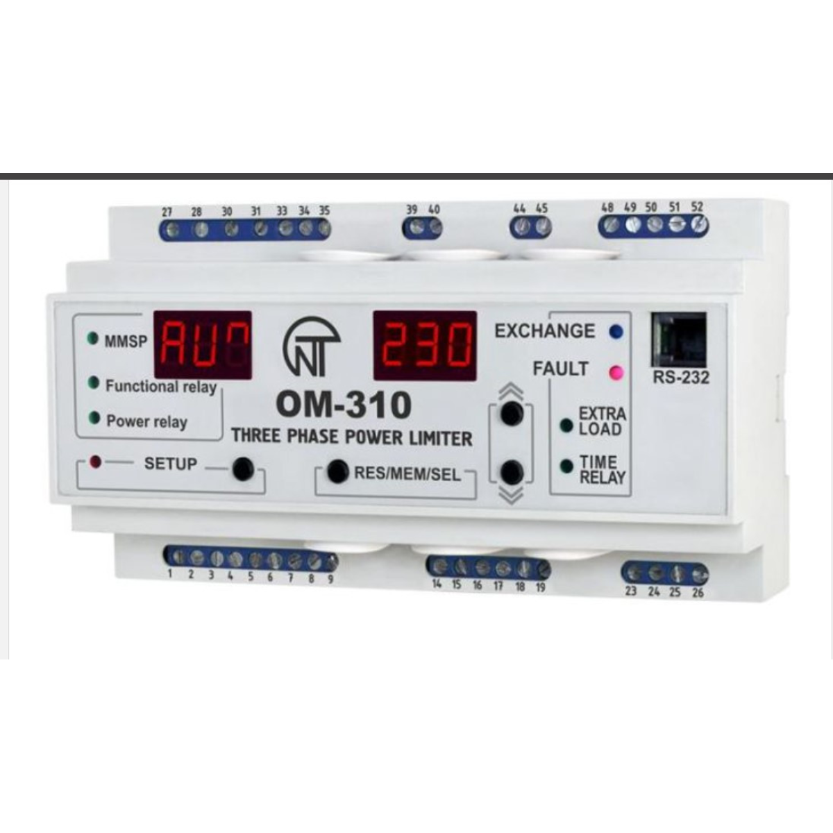 Реле обмеження потужності ОМ-310 Обмежувач потужності ОМ-310 призначений для: захисту споживача у разі неякісних параметрів електричної мережі; повного вимкнення навантаження у разі перевищення споживаною потужністю основного порога на заданий користувачем час; часткового вимкнення навантаження у разі перевищення споживаною потужністю додаткового порога на заданий користувачем час; вимірювання й індикації параметрів трифазної електричної мережі (дійсних значень фазних і лінійних напруг; напруги прямої, зворотної та нульової послідовностей; активних значень фазних струмів; споживаного навантаження активною, реактивною та повною потужності, косинусу фі); сповіщення про аварійні ситуації; дистанційного під“єднання та вимкнення навантаження через інтерфейс RS-232/RS485 або зовнішній вимикач. Пристрій забезпечує роботу з навантаженням потужністю від 2,5 кВт до 30 кВт у разі використання вбудованих струмових трансформаторів і до 350 кВт під час використання зовнішніх токових трансформаторів, зокрема й у мережах із ізольованою нейтраллю. ОМ-310 забезпечує такі типи захистів споживача: у разі неякісної мережевої напруги (недопустимі стрибки напруги, обрив фаз, порушення чергування та злипання фаз, перекіс фазних/лінійних напруг); у разі перевищення заданого максимального струму за будь-якою фазою навантаження; за струмами витоку на «землю». За кожним типом захисту можливе обмеження й роздільна здатність автоматичного повторного вмикання навантаження. Захист електрообладнання забезпечується способом керування котушкою магнітного пускача (контактора).