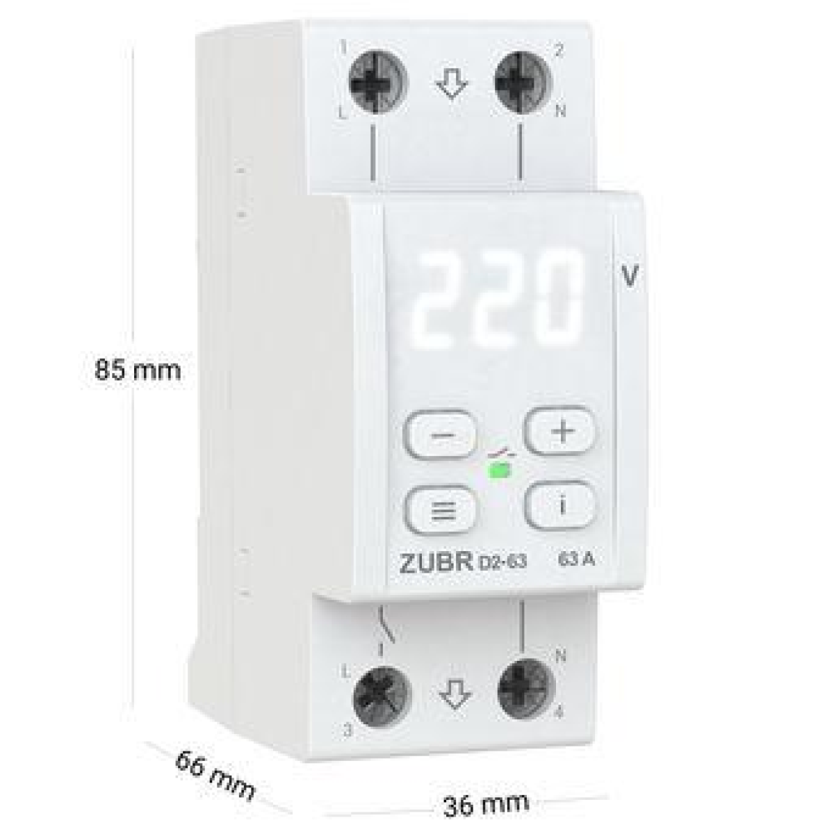 ZUBR D2-63 захищає обладнання від високої та низької напруги, а також від обривання нуля. Під час настання аварійної ситуації реле напруги вимикає навантаження, а у разі нормалізації вмикає назад. Ця серія D2 є флагманським реле бренда: крім компактного корпусу завширшки 2 модулі його виділяє найбільша функціональність.