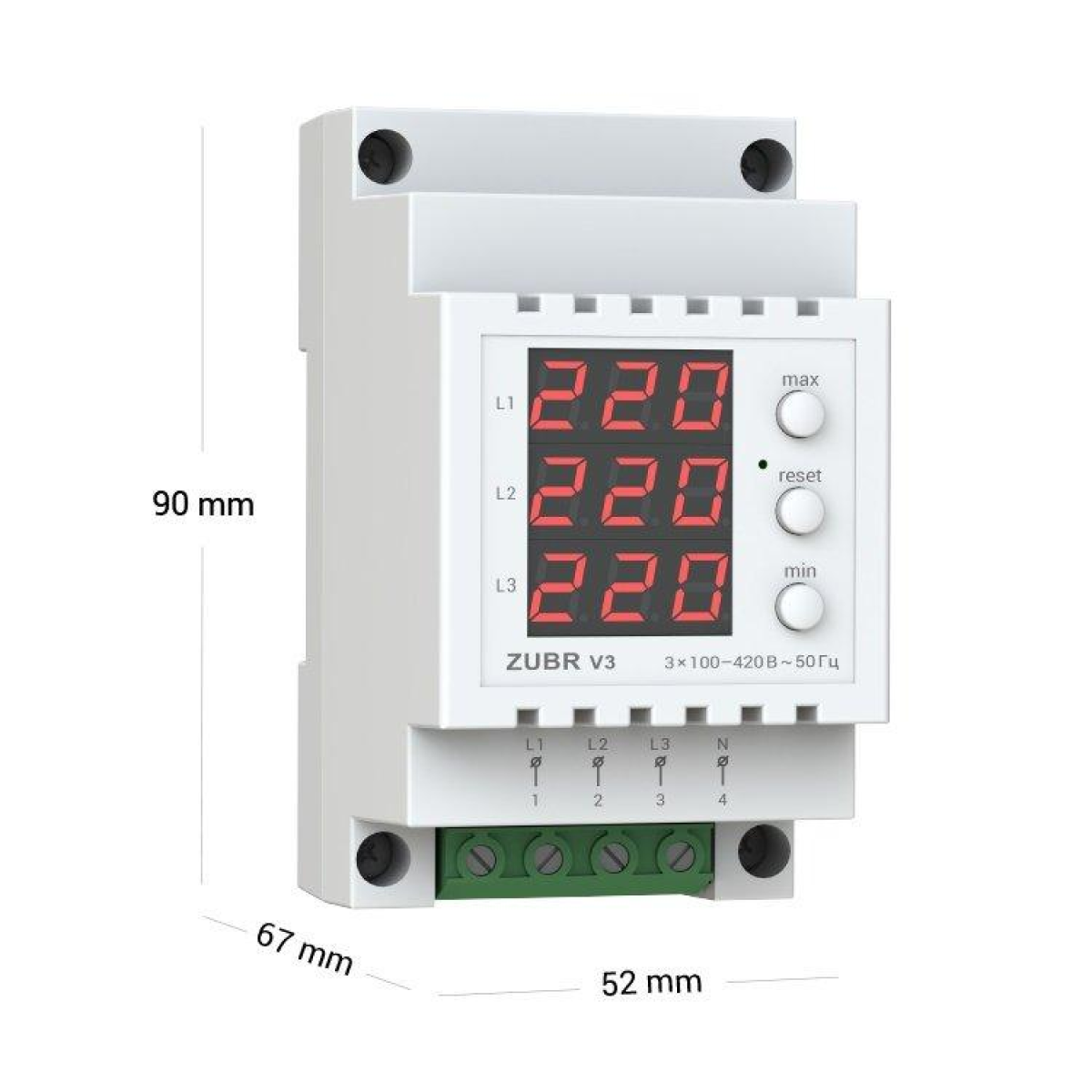 Трифазний вольтметр ZUBR V3 Трифазний вольтметр на din-рейку 3-ф. (230/380 Вольт) ZUBR V3 З вольтметром ZUBR V3 можна стежити за напругою кожної з фаз у трифазній мережі. Вольтметр починає зображати значення напруги на цифровому екрані відразу після увімкнення. Завдяки екрану можна виявити залипання й порушення послідовності фаз. Зручне керування й інформативність ZUBR V3 Керування вольтметром здійснюється за допомогою трьох кнопок. Верхня кнопка дає змогу переглянути максимальне значення напруги з моменту останнього скидання, а нижня — мінімальне. Скидання значень відбувається за допомогою середньої кнопки. Вольтметр обладнаний енергонезалежною пам“яттю, тому вимкнення живлення не призводить до втрати даних про критичні значення напруги. Калібрування відбивного напруги ZUBR V3 Ви можете редагувати напругу, що зображається відповідно до вашого контрольного пристрою.