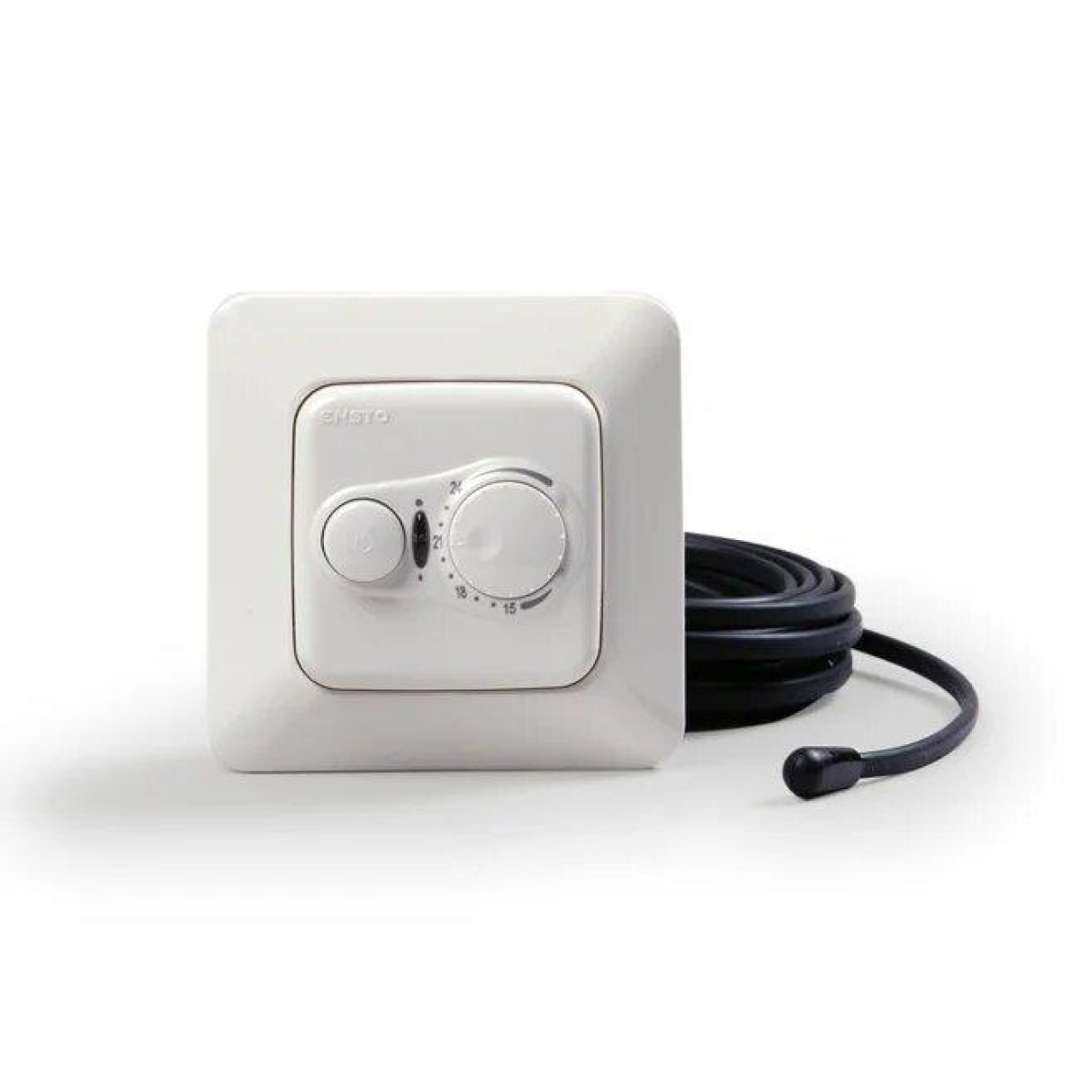 ПРЯМА ЗАМІНА: ECO10FJ Терморегулятор з датчиком підлоги Терморегулятор для регулювання температури підлоги в приміщеннях. Номінальний струм 10 А, резистивне навантаження. Максимальне навантаження 2200 Вт. Падіння температури на 4°С. Напруга 220/230 В, +10%, 50 Гц. Діапазон регулювання: +10°С...+60°С. Датчик-NTC 4 м, макс. Ø 7,5 мм, можливість продовження до 10 м MMJ 2x1,5 мм2. Опір: 47 kΩ (25°C). Діапазон робочих температур: -20°С...+30°С. Може застосовуватися з серіями електроустановочних виробів Ensto Jussi і Elko. IP31.