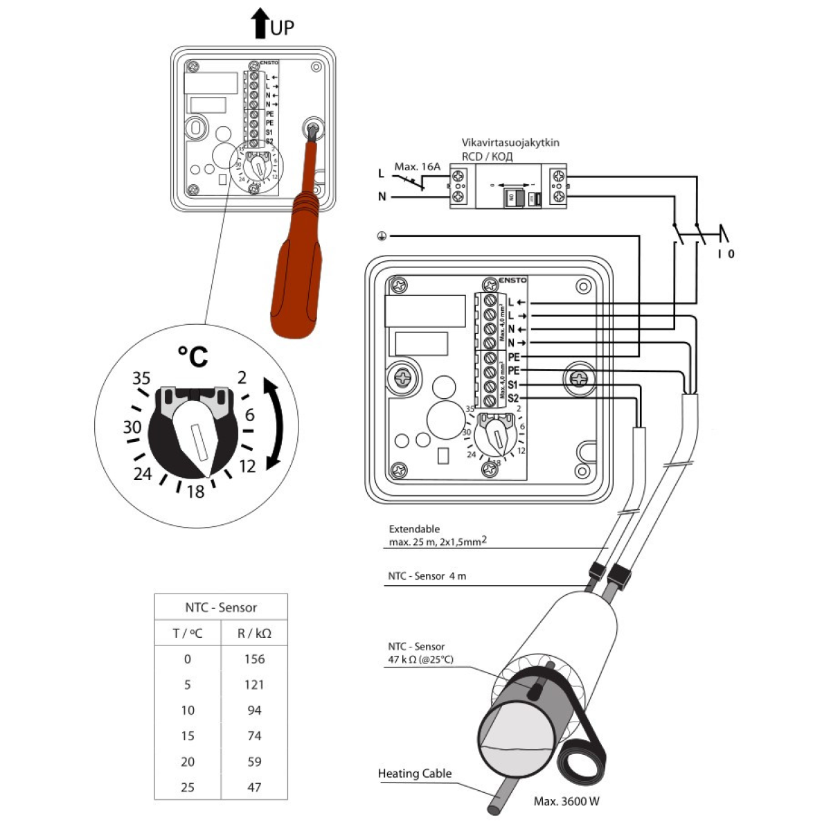ECO500 Терморегулятор для захисту від замерзання трубопроводу Для управління системами захисту від замерзання трубопроводів. Датчик встановлюється на поверхні труби в передбачуваному найбільш холодному місці. Номінальний струм 16А, резистивне навантаження. Макс. навантаження 3600 Вт. Діапазон регулювання +2ºC...+35 C. Датчик 4м (47кОм/25ºC), можливість продовження до 25 м MMJ 2 x 1,5 мм2. IP55.