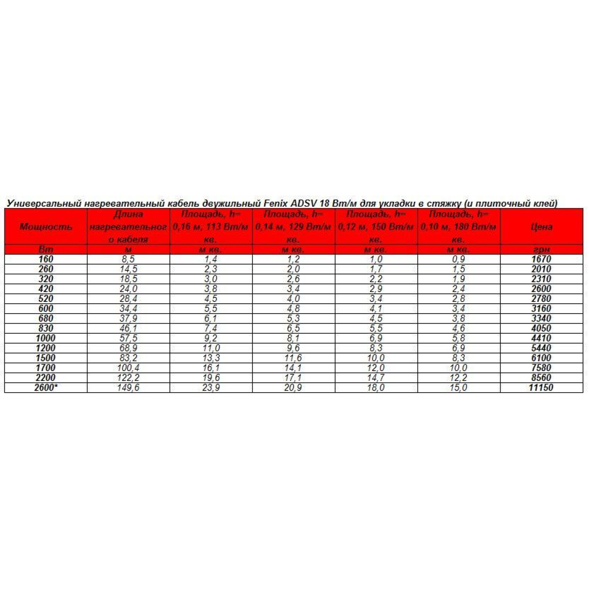 Комплект гріючого двожильного кабелю ADSV18 FENIX на 160 Вт. ADSV 18160 УНІВЕРСАЛЬНИЙ НАГРІВАЛЬНИЙ КАБЕЛЬ ДВУХЖИЛЬНИЙ FENIX ADSV 18 Вт/м ADSV 18160 - ДЛЯ УКЛАДКИ В СТЯЖКУ І ПЛИТОЧНИЙ КЛЕЙ 8,5 М, 160 Вт Тип Потужність Довжина: Площа, h = 0,14 м Площа, h = 0,12 м Площа, h = 0,10 м Площа, h = 0,08 м ADSV Вт м 129 Вт/мкв. 150 Вт/м кв. 180 Вт/м кв. 225 Вт/м кв. 18160 160 8,5 1,2 1,0 0,9 0,7 Нагрівальний кабель ADSV 18160 — двожильний кабель із повним захисним обплетенням, придатним для укладання в приміщеннях із підвищеною вологістю. для систем прямого опалення або реновації підлог (установлення під плитку). діаметр кабелю 3,4-4,2 мм. 230 В. Холодний кінець 1 × 3 м (halogen free). Кабель для теплої підлоги ADSV 18160 використовуються для укладання в стяжку 3-8 см або плитковий клей. Перед укладанням кабелю необхідно укладати теплоізолятор (рекомендується екструдований пінополістирол від 2 см, у крайньому разі підкладку для ламінату 5 мм). Кабель не рекомендується укладати безпосередньо на теплоізолятор. Теплоізолятор необхідно залити чорновою стяжкою, у крайньому разі покласти зверху металеву сітку (армовану або простьобально-витяжну). У разі укладання сітки необхідно залишити простір між кабелем і теплоізолятором, щоб під час заливання рідким розчином для стягування заповнити цей простір сумішшю. Стяжка має бути з мінімальною кількістю повітряних порожнеч.