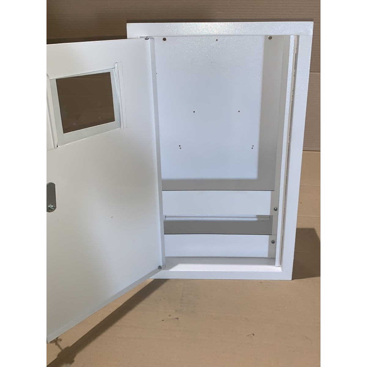 ЩИТ ОБЛІКОВО-РОЗПОДІЛЬНИЙ ЩУРв-3/12 (ЩРВ-3-12) Щит ЩУРв-3/12 (ЩРВ-3-12) - вбудований металевий щит для монтажу трифазного лічильника та модульних пристроїв до 12 модулів. ЩУРв-3/12 (ЩРВ-3-12) використовується для обліку та розподілу електроенергії. Застосовується для збирання обліково-розподільчих щитів із використанням модульних пристроїв. У щиті передбачено місце під трифазний лічильник і місце для модульної апаратури до 12 модулів. Комплектація: Замок із 2 ключами DIN рейка Характеристики: місце для встановлення трифазного лічильника; можливість встановлення до 12 однополюсних автоматичних вимикачів; товщина металу корпусу – 0,5 мм; фальш-панель із можливістю опломбування; порошкове фарбування; ступінь захисту IP42; внутрішнє виконання; оглядове вікно для зняття показань лічильника “не відчиняючи двері“ (зі склом);