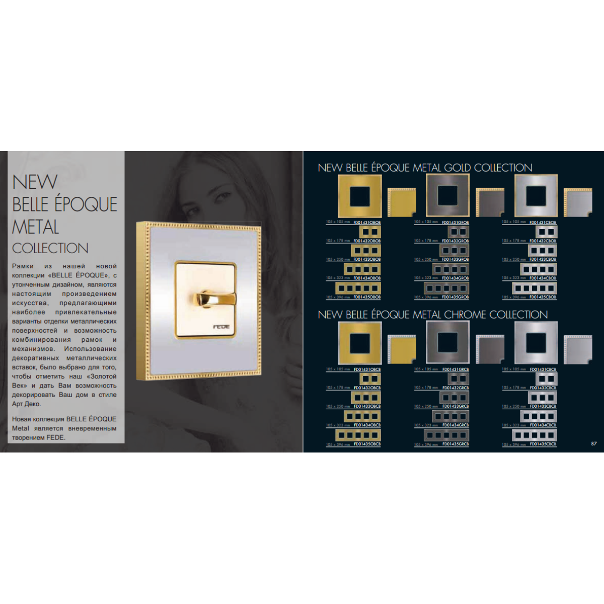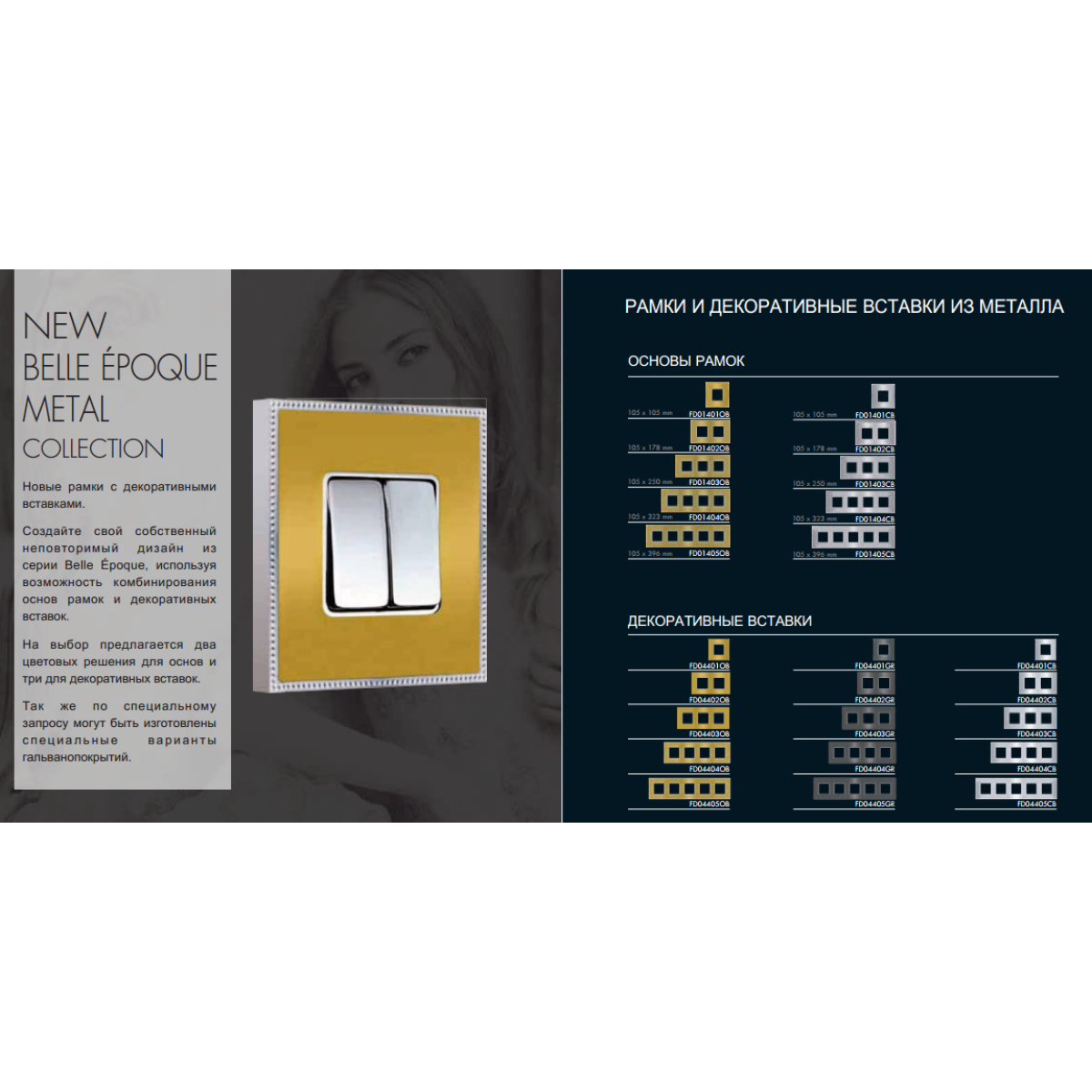 Дух творчості дизайнерів FEDE, що дозволяє створювати справжні об“єкти «Haute-Decor», повною мірою втілюються у нашій новій колекції, що поєднує строгу геометрію форм з незвичайними комбінаціями використовуваних матеріалів: метал, гобелен, дерево, камінь (Corian) і фарфор. FEDE пропонує використовувати поєднання дорогих матеріалів і філігранної обробки, що дозволяє зробити інтер“єр Вашого будинку більш стильними. Нова колекція BELLE ÉPOQUE Metal є позачасовим творінням FEDE. Рамки з нашої нової колекції «BELLE ÉPOQUE», з витонченим дизайном, є справжнім витвором мистецтва, що пропонують найбільш привабливі варіанти обробки металевих поверхонь і можливість комбінування рамок і механізмів. Використання декоративних металевих вставок, було вибрано для того, щоб відзначити наш «Золотий Вік» і дати Вам можливість декорувати Ваш будинок в стилі Арт Деко. Нові рамки з декоративними вставками. Створіть свій власний неповторний дизайн з серії Belle Époque, використовуючи можливість комбінування основ рамок і декоративних вставок. На вибір пропонується два колірних рішення для основ і три для декоративних вставок. Так само за спеціальним запитом можуть бути виготовлені спеціальні варіанти гальванопокриттів. Сайт компанії: Назва: Электроэлан Адреса: вул. Генерала Пушкіна, д. 1 , Дніпропетровськ , 49050 , Україна Телефон: +380 (56) 721-58-46, телефон (факс) +380 (67) 520-74-00, мобільний Email: electroelan@mail.ru