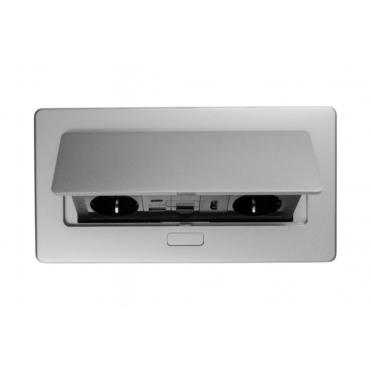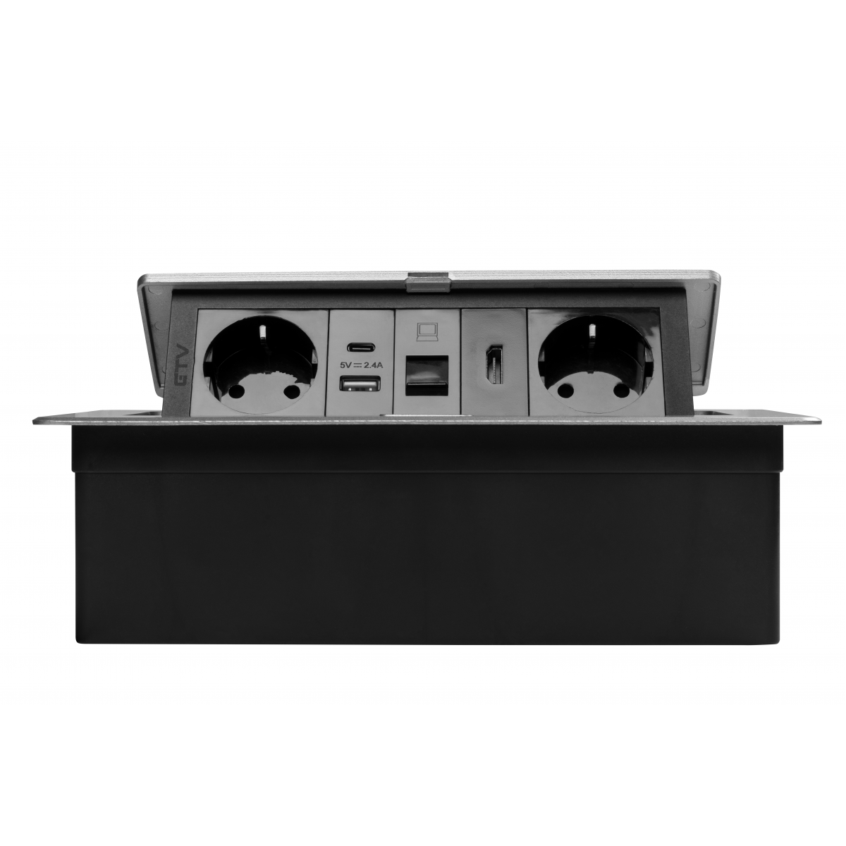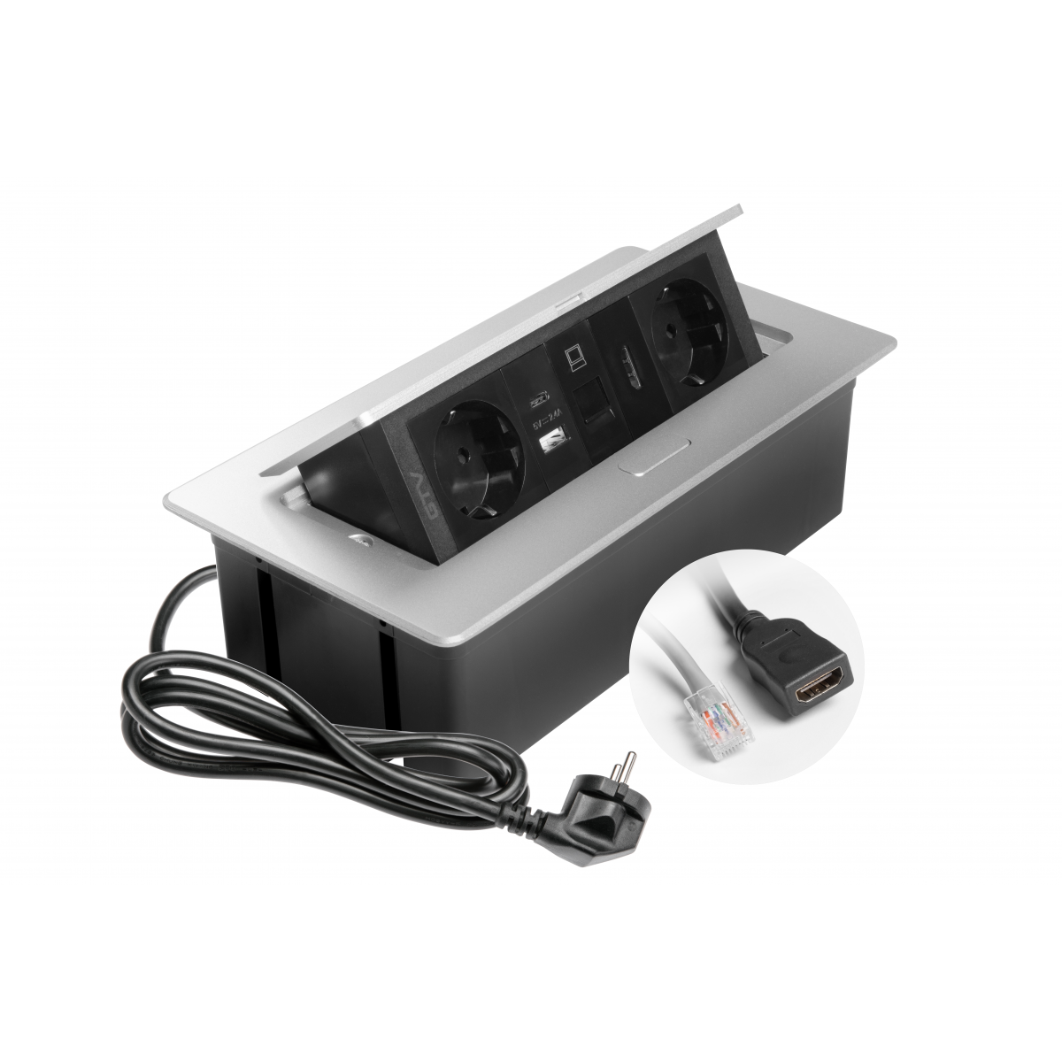 Меблева розетка GTV MULTISOFT, 2хSHUKO, USB A+C, RJ45, HDMI з кабелем 1.5 м, алюмінієва Функціональна й ергономічна меблева розетка GTV AE-PBSURH2GS-53, монтована в стільницю. Вона полегшує підтримання порядку після роботи. Естетична розетка GTV MULTISOFT також є елементом письмового столу, столу для переговорів або кухонної стільниці. Вона обладнана елегантними та тонкими кришками для захисту від пролитих рідин і бруду. Розетка Multisoft є доповненням до сімейства розеток GTV SOFT. Вони вирізняються своєю багатофункціональністю завдяки різним портам: силова розетка EUR 16А 2P+PE (SHUKO) - 2шт комп“ютерна розетка RG45 - 1шт розетка USB A+C - 1шт розетка HDMI - 1шт