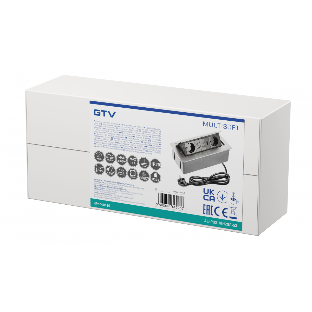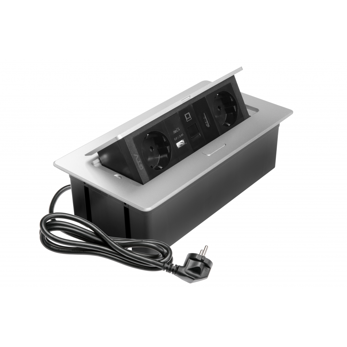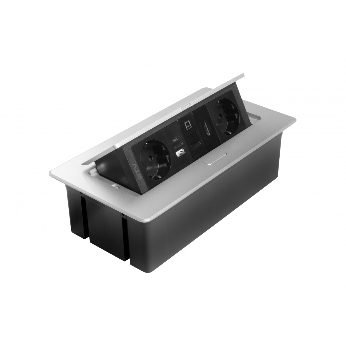 Меблева розетка GTV MULTISOFT, 2хSHUKO, USB A+C, RJ45, HDMI з кабелем 1.5 м, алюмінієва Функціональна й ергономічна меблева розетка GTV AE-PBSURH2GS-53, монтована в стільницю. Вона полегшує підтримання порядку після роботи. Естетична розетка GTV MULTISOFT також є елементом письмового столу, столу для переговорів або кухонної стільниці. Вона обладнана елегантними та тонкими кришками для захисту від пролитих рідин і бруду. Розетка Multisoft є доповненням до сімейства розеток GTV SOFT. Вони вирізняються своєю багатофункціональністю завдяки різним портам: силова розетка EUR 16А 2P+PE (SHUKO) - 2шт комп“ютерна розетка RG45 - 1шт розетка USB A+C - 1шт розетка HDMI - 1шт