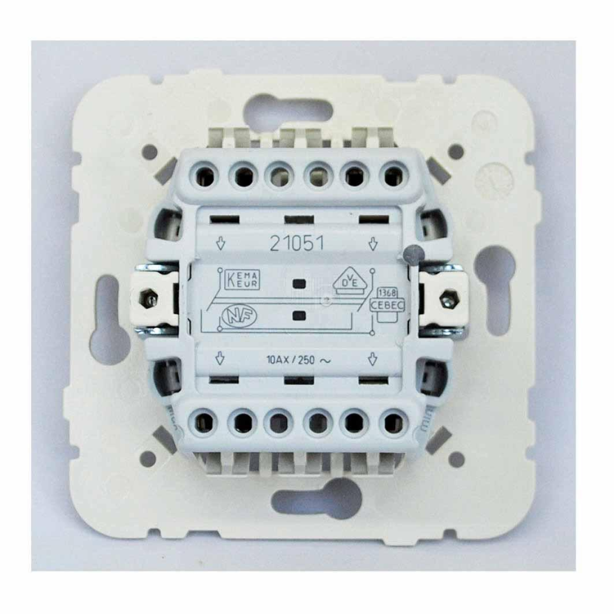 Механізм вимикача одноклавішний перехресний LOGUS 10АХ, 250V Механізми серії MEC 21 в дизайні LOGUS 90 виготовлені з міцного, високоякісного термопласту, який забезпечує надійність механізму та додаткову електробезпеку, захищає людини від можливого контакту з струмовідними частинами. Механізми серії MEC 21 —компактні, легкі, швидко та зручно встановлюються на місце в установлювальні коробки, без використання інструментів Спеціальні виступи та засувки на механізмах розеток і вимикачів дають змогу швидко та легко поміняти рамки та підібрати потрібний дизайн до колірної гами вашого інтер“єру. Перевірити наявність напруги можна без демонтажу пристрою. Механізм обладнаний отворами, через які здійснюється перевірка за допомогою індикатора або мультиметра Система кріплення супортів між собою, дає змогу швидко та надійно розміщувати механізми, і як наслідок, рамки завжди ідеально розміщені на стіні, без перекосів На вимикачі нанесені спеціальні піктограми. Це робить зручним встановлення механізмів, тому що тепер неможливо переплутати верх, низ тощо.