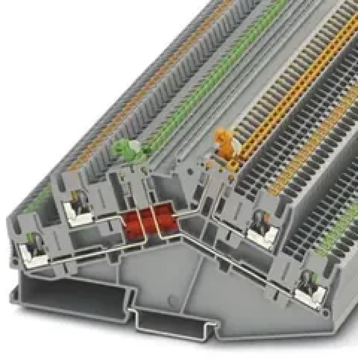 Клеми з ножовими размыкателями, два яруси, скошений контур і два роздільних ножа, тип підключення: Затискачі Push-in, перетин: 0,14 мм2 - 4 мм2, AWG: 26 - 12, довжина: 127,5 мм, ширина: 5,2 мм, колір: сірий, монтаж: NS 35/7,5, NS 35/15