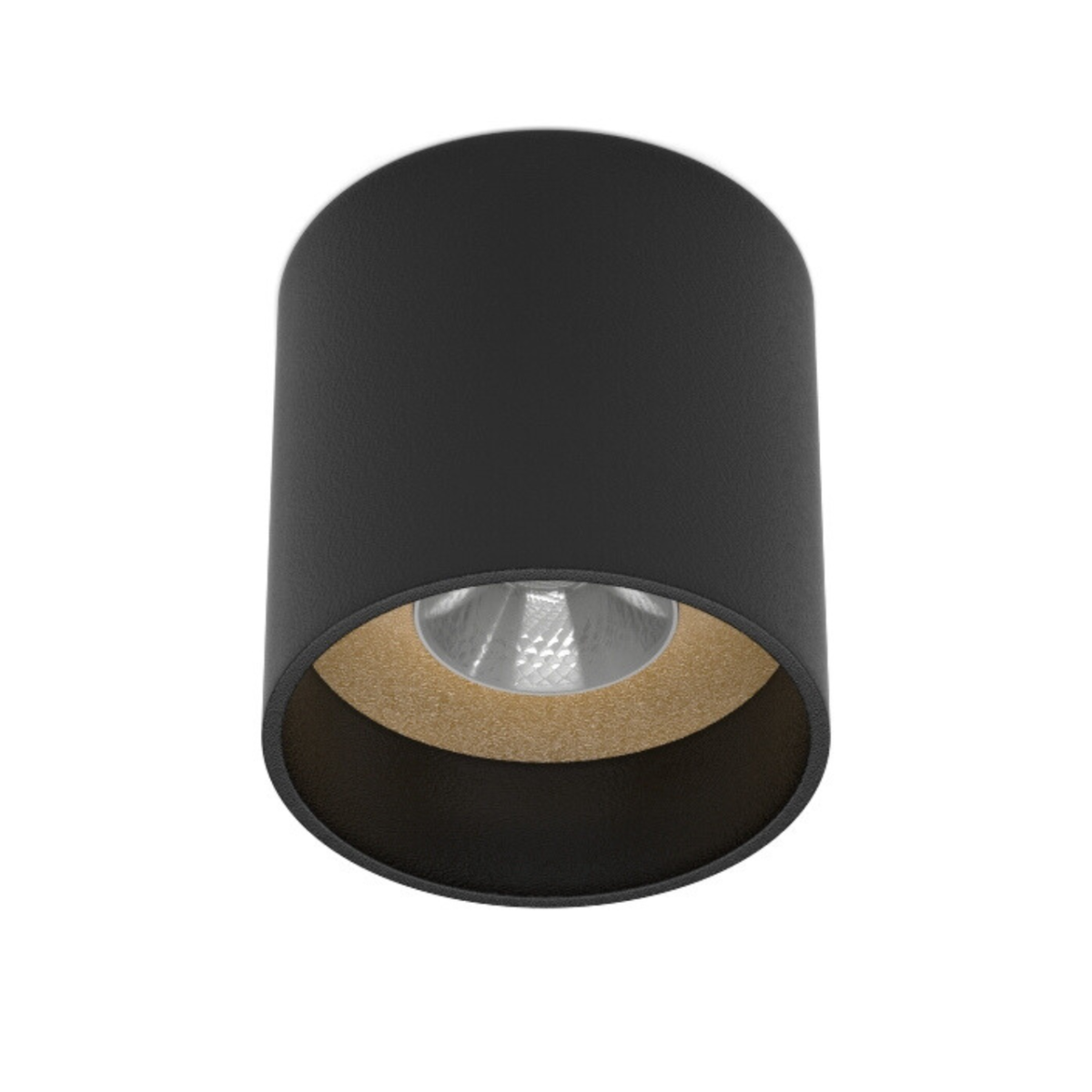 Світильник накладний ULIGHT Roll. Колір корпусу: чорний. Колір декоративної накладки: золотий. Потужність: 12W. CRI: 90. Напруга: 220V(вбудований драйвер). Кольорова температура: 4000К. Світловий потік - 960Lm. Кут світіння 50 град. Розміри: ¢80*80. Гарантія 5 років
