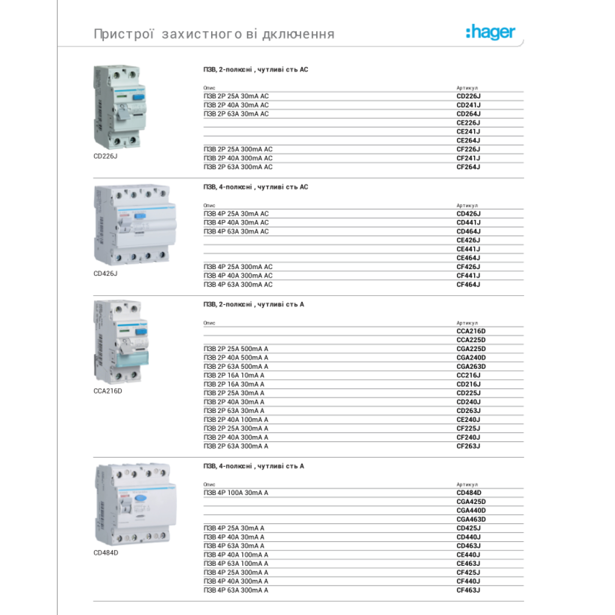 Пристрій захисного вимкнення УЗО Hager 4P 25A AC 30 мА двополюсне 230 V CD426J Вимикач диференціального струму або як за іншим його називають: пристрій захисного вимкнення або дифреле CD426J виробництва Hager (Німеччина) — призначений для захисту від ураження електричним струмом людини, а також тварин. Оскільки це ПЗВ Hager CD426J має клас чутливості АС, то воно здатне вловлювати струми витоку не тільки звичайного змінного синусоїдального струму, а й витоку імпульсного характеру, які можуть виходити від сучасних побутових приладів, які мають імпульсні блоки живлення. А зазвичай практично всі сучасні прилади (стиральні машини, холодильники, аудіо- та відео техніка, мікрохвильові печі) обладнані саме імпульсними блоками живлення. Основні характеристики Hager CD426J : Ланцюг: трифазна. Чутливість (ТИП): АC (перемінний струм і імпульсний пульсувальний струм). Номінальний струм: 25А Ток утечки: 30mA (0,03А). Ширина модуля: 4. Під“єднання: Багатожильні провідники: 16 мм2. Монолітні провідники: 25 мм2.