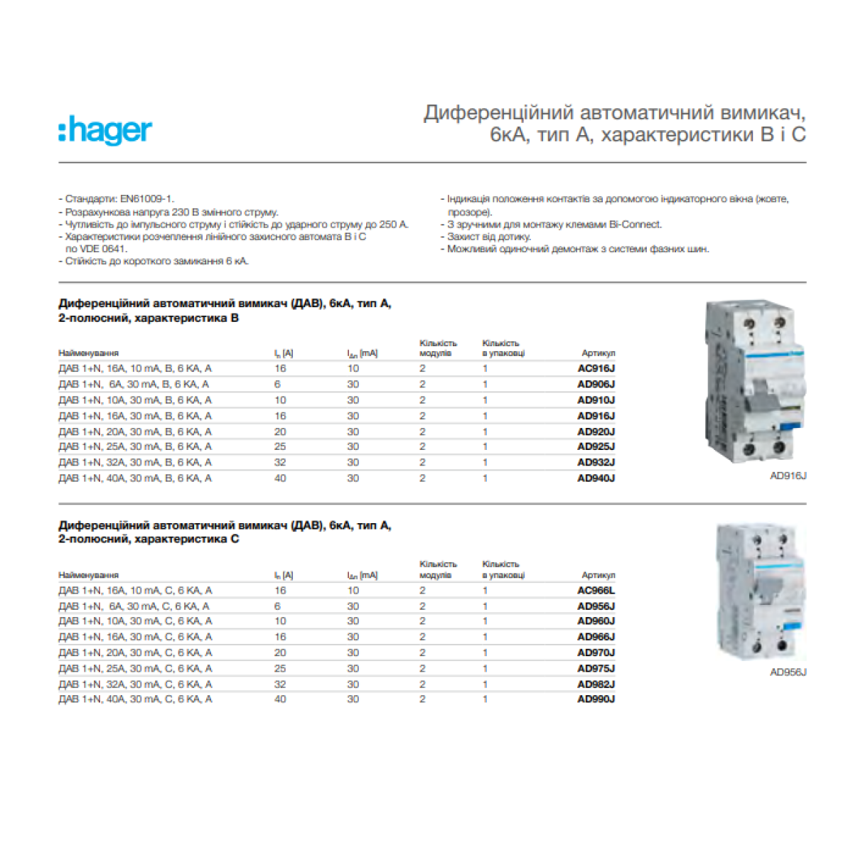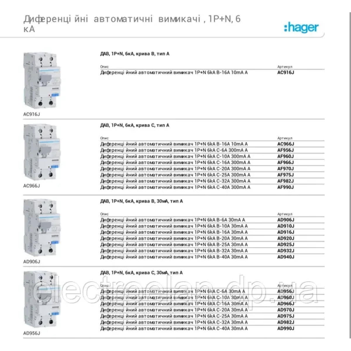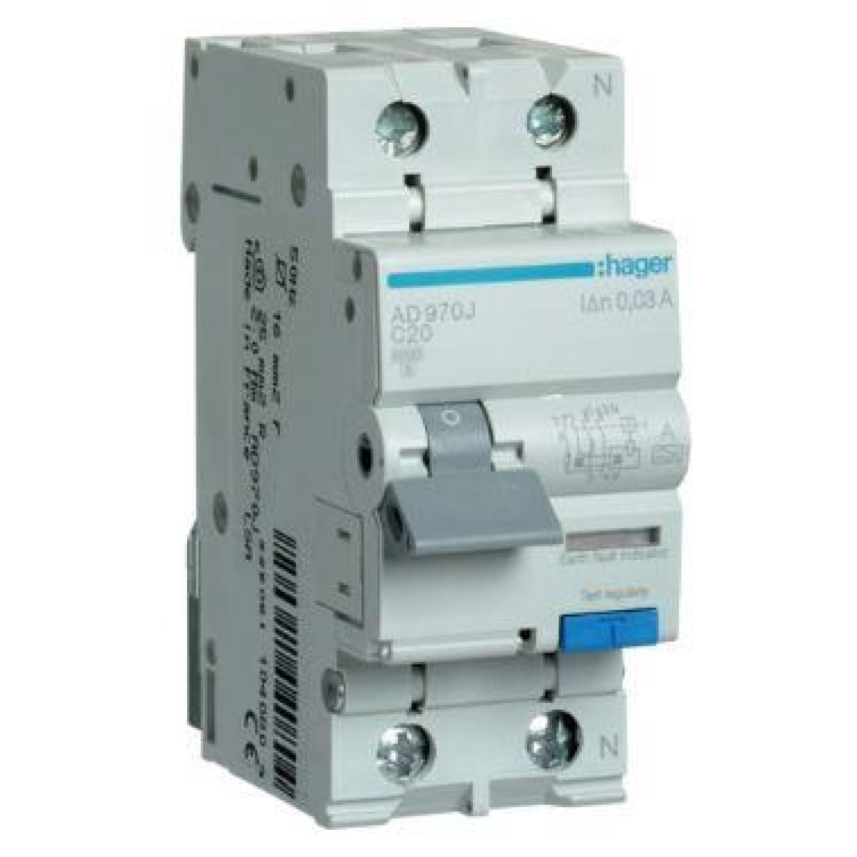 Диференційний автомат Hager 1+N C20/30mA 6кA,тип A ADA970D