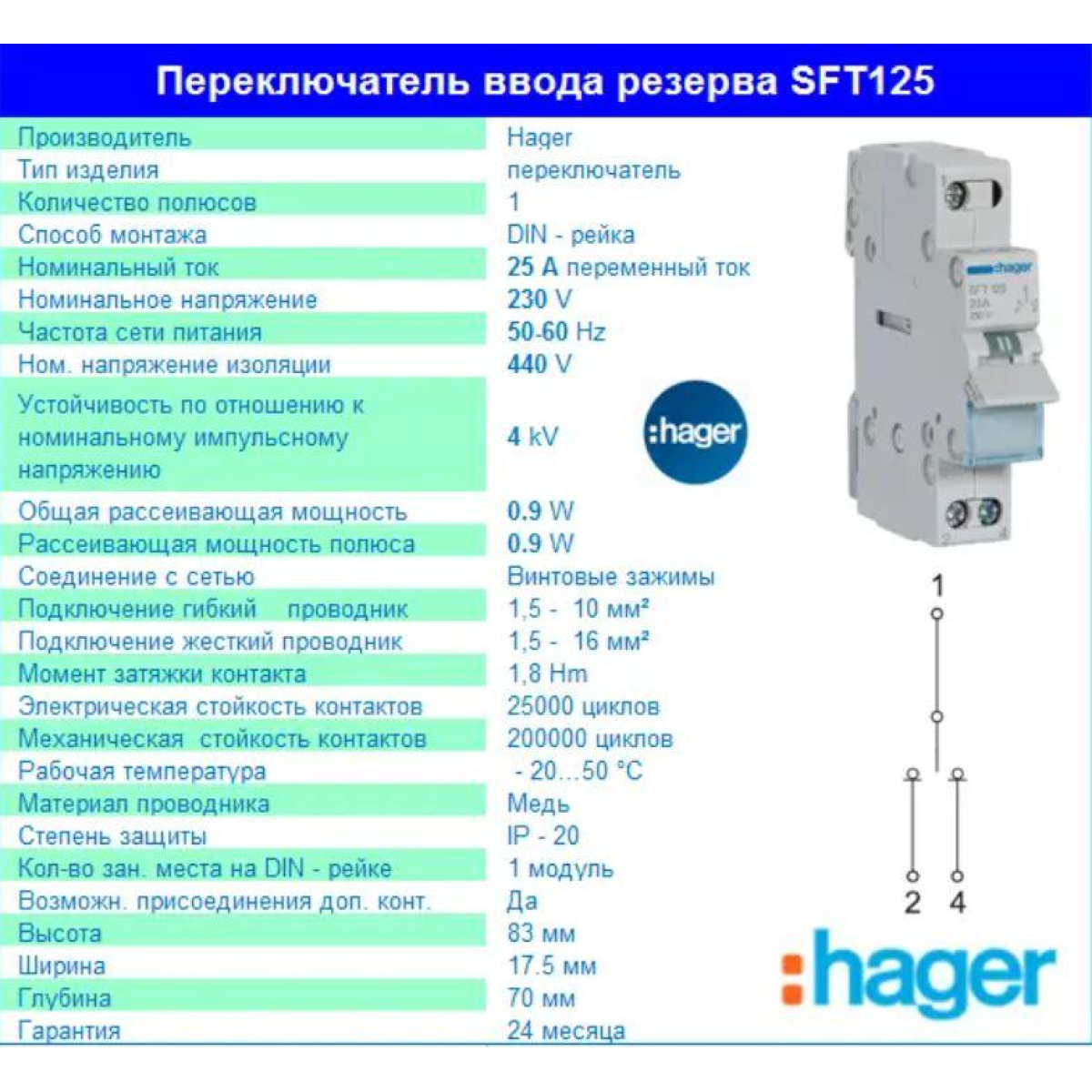 Перемикач введення резерву 25 А, 1 полюс, SFT125 Hager