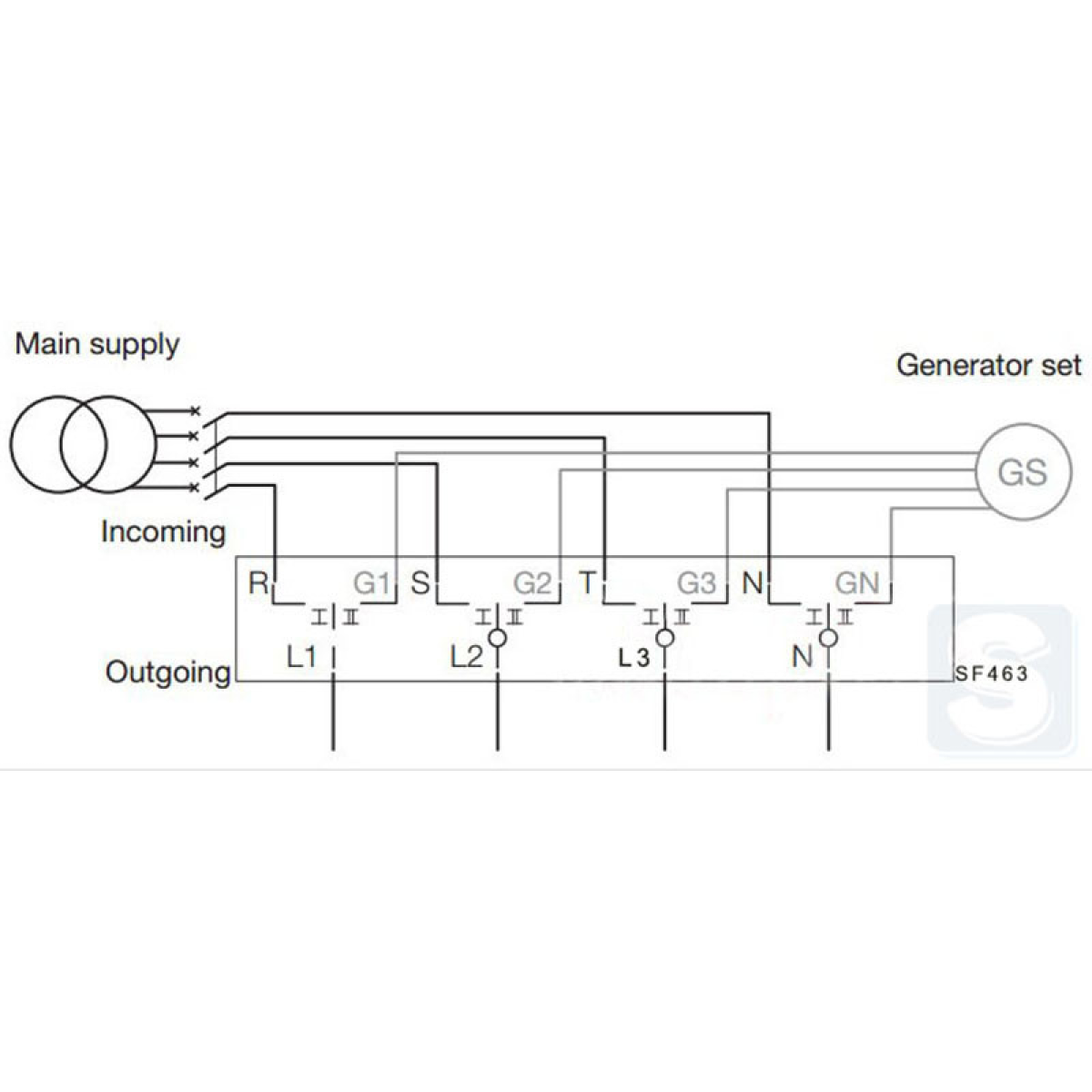 Модульний перемикач навантаження HAGER SF463 4P 63A 1-0-2 240/415V~ SF463 Трипозиційний перемикач введення резерву HAGER SF463 4P 63A 1-0-2 у модульному виготовленні для 1-фазної та 3-фазної мереж SF463 Модульний перемикач навантаження трипозиційний HAGER 4P 63A 1-0-2 SF463 предназначен для здійснення ручного перемикання з основного джерела живлення на резервний, наприклад, під час використання генератора або інвертора. Пристрій має загальний верхній контакт і ручку керування трипозиційним станом контактів (1 - 0 - 2). Технічні характеристики: Виготовлення: 4P (чотириверирусний). Мережа: однофазна. Схема: 1-0-2 Номінальна напруга мережі: 230/400V~ Номінальний струм: 63А Електричний ресурс (циклів): 1500 Механічний ресурс (циклів): 8500 Ступінь захисту: IP20 Експлуатаційна температура: -5 °C.. +40°C Клеми для під“єднання кабелю: 16 mm2 Кількість модулів на стандартній дин-рейці: 2