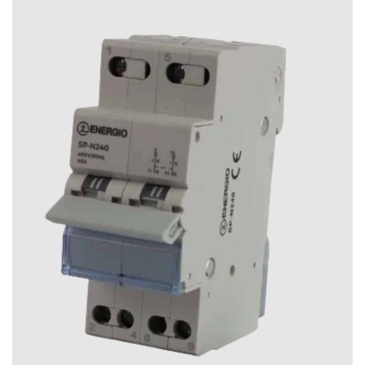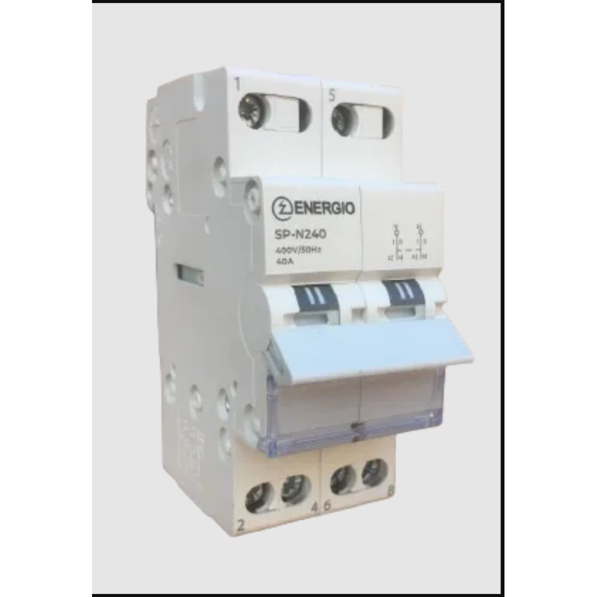 Модульний перемикач навантаження трипозиційний 2P 40A 1-0-2 240/415V~ SP-N240 Перемикач навантаження трипозиційний 2P 40A 1-0-2 у модульному виконанні для 1-фазної мережі SP-N240 Модульний перемикач навантаження трипозиційний 2P 40A 1-0-2 SP-N240 2P предназначен для здійснення ручного перемикання з основного джерела живлення на резервний, наприклад, під час використання генератора або інвертора. Пристрій має загальний верхній контакт і ручку керування трипозиційним станом контактів (1 - 0 - 2). Технічні характеристики: Виконування: 2P (двополюсний). Мережа: однофазна Схема: 1-0-2 Номінальна напруга мережі: 230/400V~ Номінальний струм: 40А Електричний ресурс (циклів): 1500 Механічний ресурс (циклів): 8500 Ступінь захисту: IP20 Експлуатаційна температура: -5 °C.. +40°C Клеми для під“єднання кабелю: 10 mm2 Кількість модулів на стандартній дин-рейці: 2