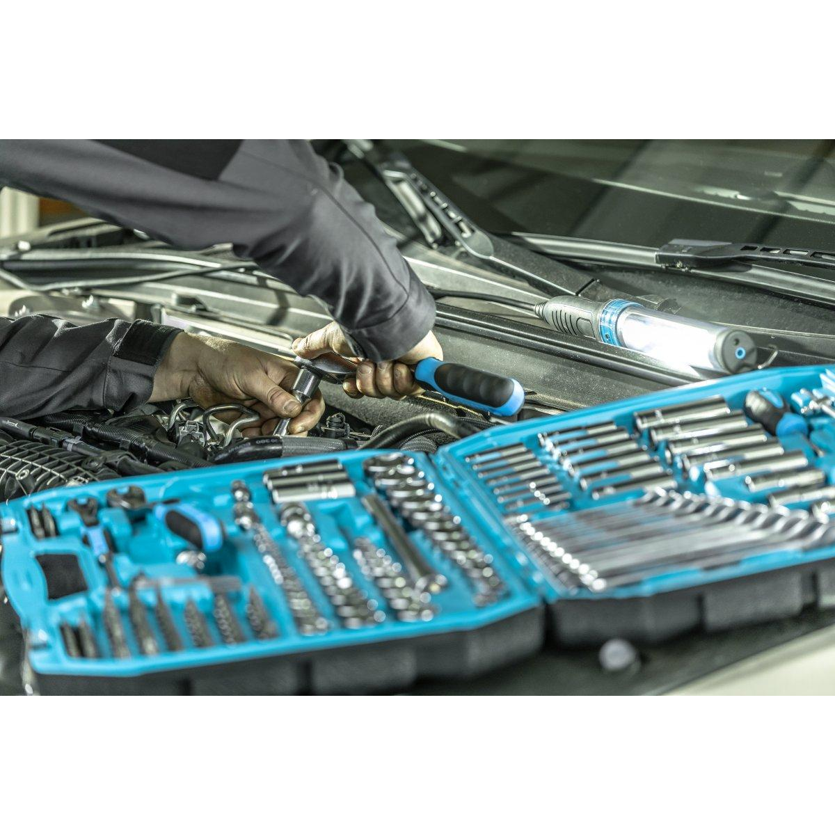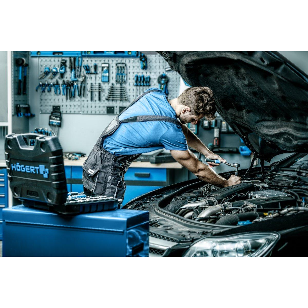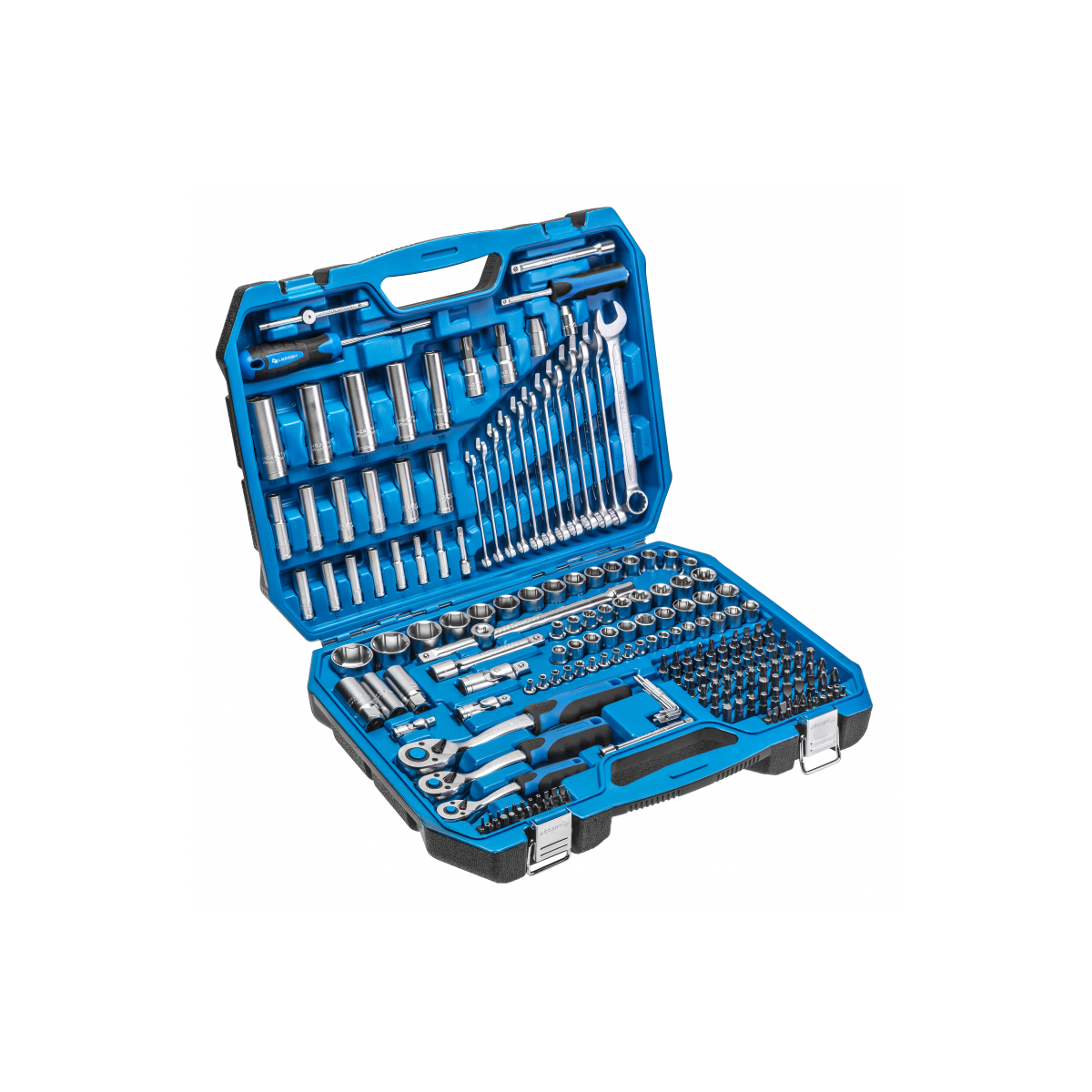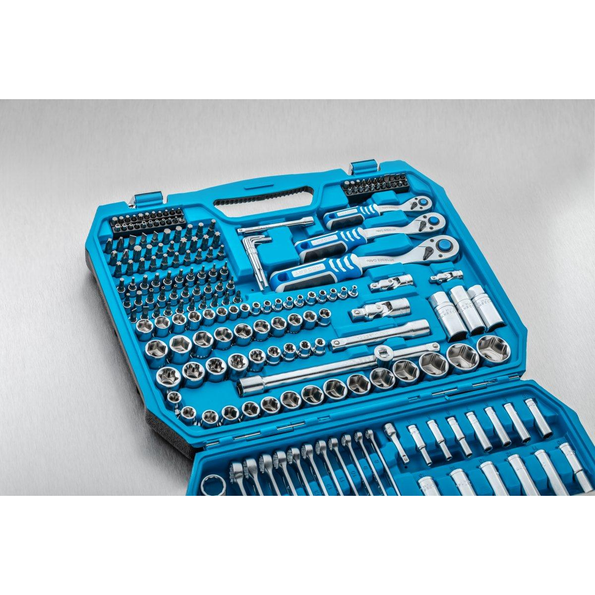 Інструменти HOEGERT набір 222 шт. 1/4“ 3/8“1/2“ (HT1R444) Характеристика торцеві головки, біти та аксесуари виготовлені з високоякісної легованої сталі; стійкі до інтенсивних навантажень; ковані; храповики трещоток з 72 зубцями виготовлені з легованої сталі CrMo, що підвищує надійність і довговічність механізму; набір постачається в двох кольорах з металевими замками і петлями; практичне і зручне розміщення комплектуючого набору в штатних місцях. Набір включає: Комбіновані ключі: 8 / 9 / 10 / 11 / 12 / 13 / 14 / 15 / 16 / 17 / 18 / 19 мм Трещотка 1/2” з 72 зубцями Головки торцеві 1/2”: 10 / 11 / 12 / 13 / 14 / 15 / 17 / 19 / 20 / 21 / 22 / 24 / 27 / 30 / 32 мм Головки глибокі 1/2”: 16 / 17 / 18 / 19 / 22 мм Головки вічкові шестигранні 1/2”: 16 / 21 мм Головки Torx 1/2”: E18 / E20 / E22 / E24 Т-подібний вороток-подовжувач1/2” 254 мм Подовжувач 1/2” 125 мм Шарнір карданний 1/2” Бітотримач 1/2” для біт 5/16” Торцеві насадки 1/2”: T55/ T60 Трещотка 3/8” з 72 зубцями Головки торцеві 3/8”: 10 / 11 / 12 / 13 / 14 / 15 / 16 / 17 / 18 / 19 мм Головки глибокі 3/8”: 10 / 11 / 12 / 13 / 14 / 15 мм Головки Torx 3/8”: E8 / E10 / E12 / E14 / E16 Головка вічкова шестигранна 3/8” 18 мм Шарнір карданний 3/8” Подовжувач 3/8”, 125 мм Бітотримач 3/8” для біт 5/16” Трещотка 1/4” з 72 зубцями Головки торцеві 1/4”: 4 / 4,5 / 5 / 5,5 / 6 / 7 / 8 / 9 / 10 / 11 / 12 / 13 / 14 мм Головки торцеві глибокі 1/4”: 4 / 5 / 6 / 7 / 8 / 9 / 10 мм Головки Torx 1/4”: E4/ E5/ E6/ E7/ E8 Шарнір карданний 1/4” Вороток Т-подібний 1/4” 115 мм Викрутка-вороток 1/4” Викрутка з держателем для біт 1/4” Подовжувачі 1/4” 50 и 100 мм Біти 5/16”, 30 мм:T25 / T27x2 / T30x2 / T35x2 / T40x3 / T45x2 / T50x2H5,5 / H6x2 / H7 / H8SL6 / SL6,5 / SL8 ммPH3 / PH4PZ3 / PZ4M5/ M6 / M8 / M10 Відвертні насадки 1/4”:SL4 / SL5,5 / SL6,5 / SL7 ммPH1/ PH2/PH3 PZ1 / PZ2 / PZ3T8 / T9 / T10 / T15 / T20 / T25 / T27 / T30 (TORX)T8/ T9 / T10/ T15/ T20/ T25/ T27/ T30 (TORX з розворотом)H3/ H4/ H5/ H6 Відвертні біти 1/4”, 25 мм:SL4/ SL5/ SL5,5 ммPH1/ PH2PZ1 / PZ2T8/ T10/ T15/ T20/ T25 (TORX)T10/ T15/ T20/ T25/ T40 (TORX з відверстям)M5 / M6 / M8TRI-WING 1 / 2 / 3TORQ 6 / 8 / 10SQUARE 1 / 2SERVICE 4 / 6 / 8H3 / H4 / H5 / H6H3 / H4 / H5 / H6Г-подібні шестигранні ключі: 1,27x2 / 1,5x2 / 2x2 / 2,5x2 / 3x2 / 4x2 / 5 мм