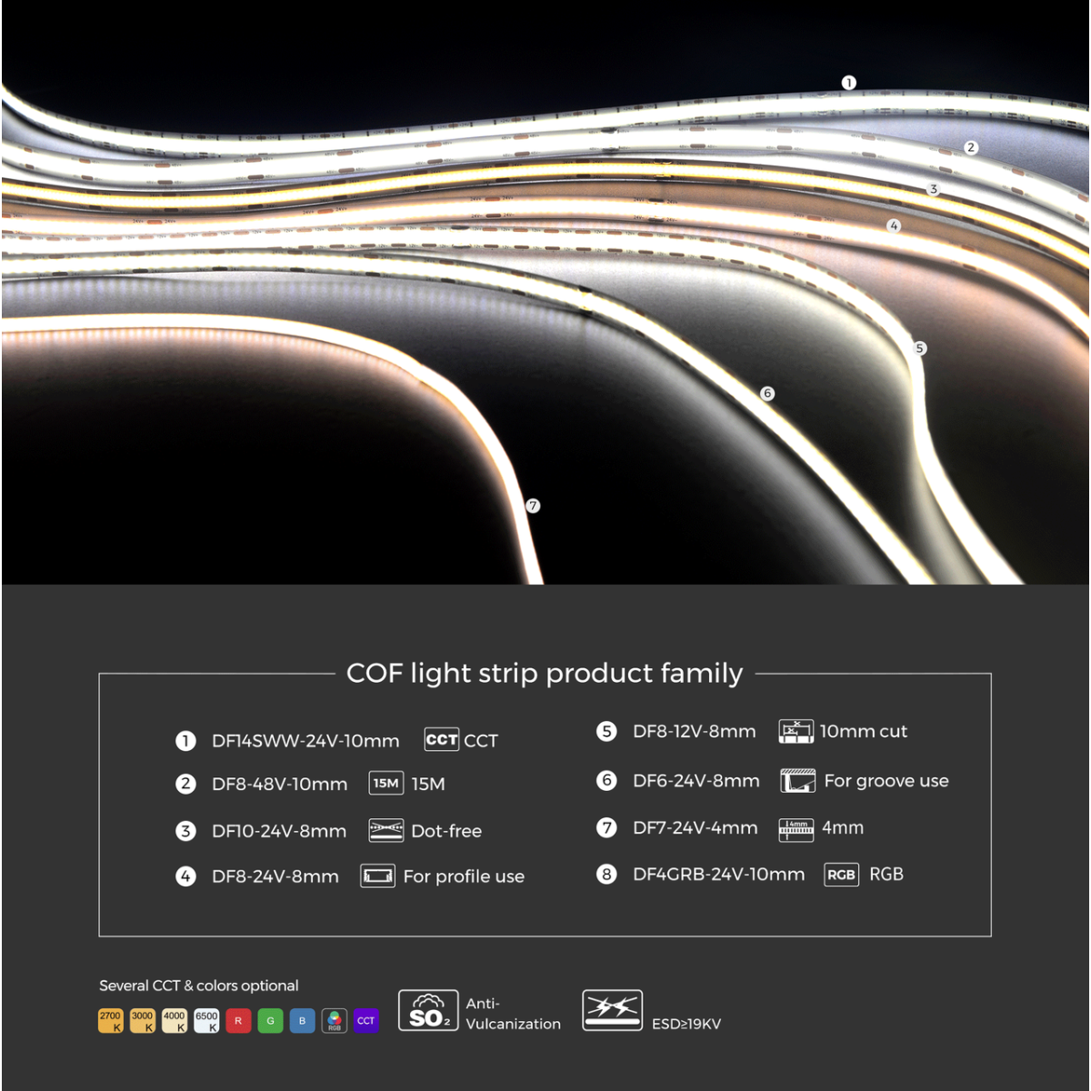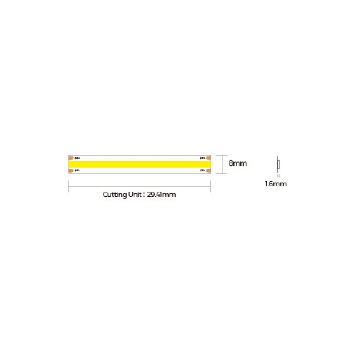 Вузька 4-мм Світлодіодна стрічка COLORS COB DP7-24V-4mm-NW Широкий кут розсіювання забезпечує рівномірне освітлення. Супертонка ширина 4 міліметри для вузьких просторів. Вільне з“єднання за допомогою конекторів без паяння. Технічні характеристики: Вхідна напруга: DC24V; Максимальна потужність: 10 Вт/метр; Типова потужність: 9 Вт/метр; Світлодіоди на метр: 420; Гнучка друкована плата (FPCB): 2 унції міді; Робоча температура: -25~40°C, максимальна температура корпусу (Tc): 75°C; Індекс передавання кольору: CRI 90; Світловий потік: 750 люменів/метр; Кратність різання: 16,6 міліметра; Максимальне послідовне під“єднання: 2500 міліметрів; Ступінь захисту: IP20; Сертифікація продукції: UL;