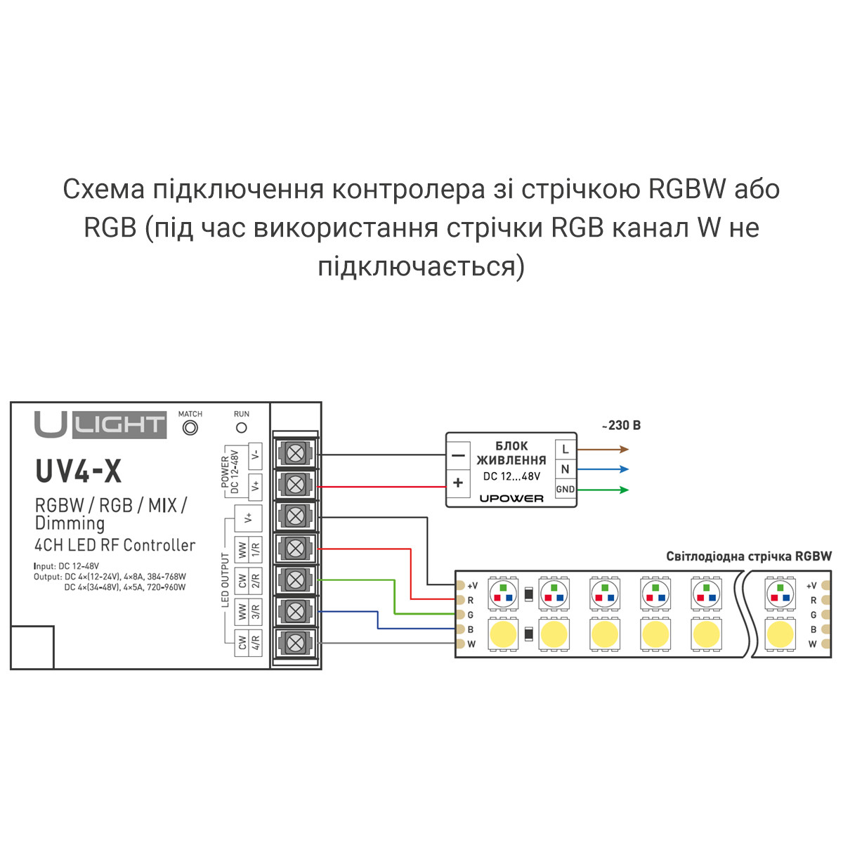 Usmart UV4-X - універсальний 4-канальний контролер для PWM (ШІМ) управління світлодіодною стрічкою та іншими світлодіодними джерелами світла з напругою живлення 12, 24, 36 або 48 В. Керується від радіочастотних пультів ДУ та настінних панелей керування серії USMARТ. Можлива прив“язка до 10 пультів ДУ або панелей управління. Може виконувати функції RGBW, RGB, MIX, DIМ – контролера. Функції, що виконуються, залежать від налаштування контролера і від пультів та панелей керування, що спільно використовуються. 10 вбудованих динамічних режимів зміни кольору в режимі RGB/RGBW. Плавне керування без видимого ока мерехтіння (4096 градацій яскравості в кожному каналі). Синхронізація виконання динамічних програм під час керування кількома контролерами з одного пульта. Автоматична ретрансляція RF-сигналу всім аналогічним контролерам, що знаходяться у радіусі до 15 метрів. Захист виходів від перевантаження та короткого замикання у навантаженні. Сумісний з великою кількістю різноманітних пультів ДУ та панелей управління серії USMARТ. Список пристроїв, що спільно використовуються, постійно розширюється.