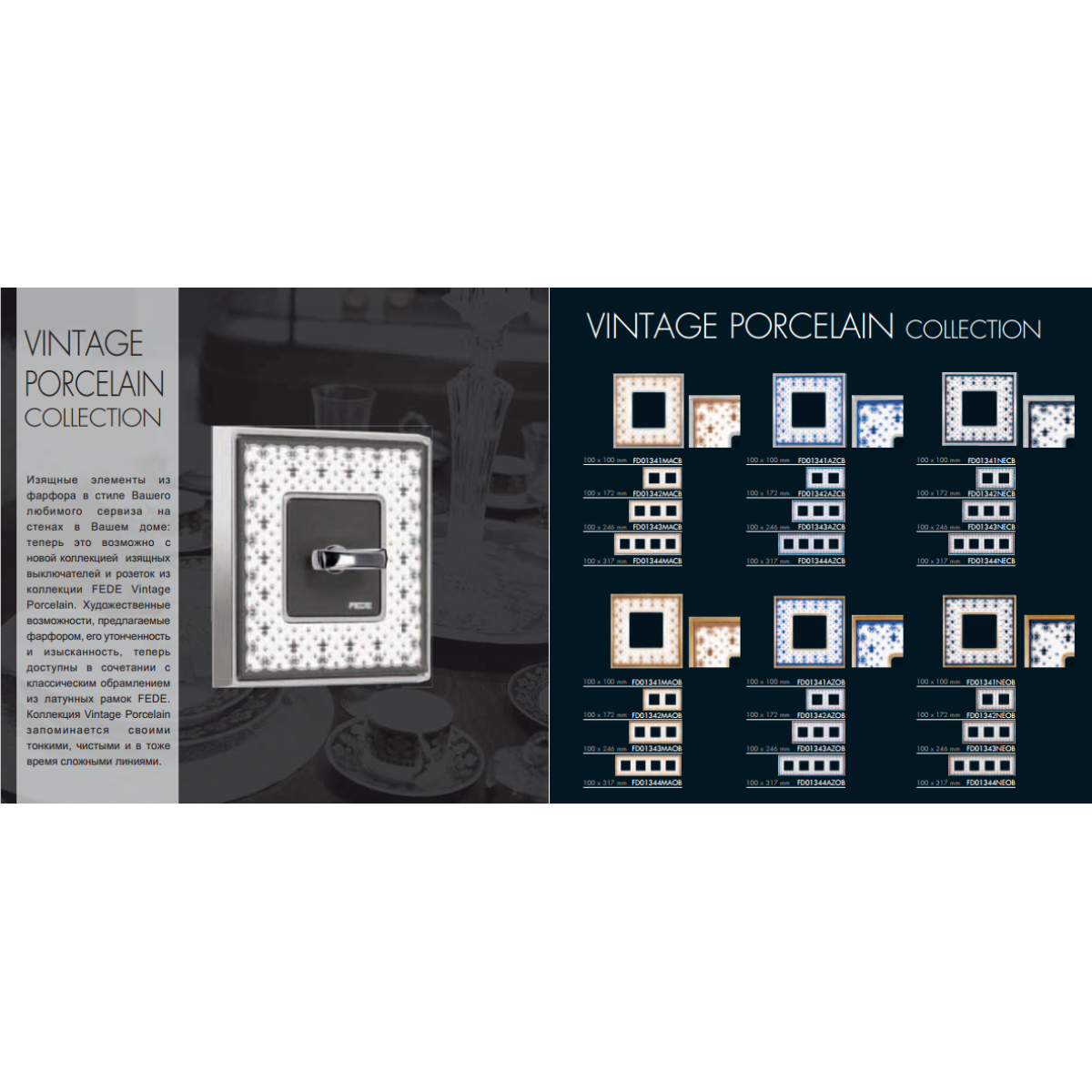 Витончені елементи з фарфору в стилі Вашого улюбленого сервізу на стінах у Вашому домі: тепер це можливо з новою колекцією витончених вимикачів і розеток з колекції FEDE Vintage Porcelain. Художні можливості, пропоновані фарфором, його витонченість і вишуканість, тепер доступні у поєднанні з класичним обрамленням з латунних рамок FEDE. Колекція Vintage Porcelain запам“ятовується своїми тонкими, чистими і водночас складними лініями. Відчуття розкоші, що передається завдяки порцеляні і є результат виключної «свіжості», яку намагалися вкласти в цю серію наші майстри, даруючи Вам прекрасну можливість насолодитися атмосферою престижу і всесвітньої популярності, властивих цього матеріалу. Рамки ексклюзивного дизайну, виготовлені з цієї латуні зі вставками зі шкіри та гобеленів з різними видами текстур, малюнків та кольорів. Серія з обмеженим випуском, ідеально підходить для унікальних проектів. Кольори латунних основ рамок для колекції VINTAGE Porcelain: блискучий нікель і блискуче золото. Рамки, за запитом замовників, можуть бути випущені в будь-якому іншому кольорі. Для вимикачів, ми пропонуємо дві моделі поворотних ручок, в кольоровій гамі збігається з кольором рамок. Рамки з наших колекцій дозволяють використовувати нове покоління стандартних вимикачів з клавішами. Широкі і вузькі клавіші, також можуть поставлятися з можливістю встановлення світлодіодного підсвічування. Універсальність установки рамок: Вертикальна / Горизонтальна. Ми пропонуємо рамки до 4х постів. Компактні розміри всіх електричних і слабкострумових механізмів забезпечують швидкий і зручний монтаж в настановні коробки і запобігають їх перегрів в процесі експлуатації. Підібрати потрібний Вам механізм дуже просто. Для монтажу наших рамок потрібен універсальний супорт, виготовлений з високоякісного поліаміду посиленого скловолокном. (код FD16-BAST). Сайт компанії: Назва: Электроэлан Адреса: вул. Генерала Пушкіна, д. 1 , Дніпропетровськ , 49050 , Україна Телефон: +380 (56) 721-58-46, телефон (факс) +380 (67) 520-74-00, мобільний Email: electroelan@mail.ru