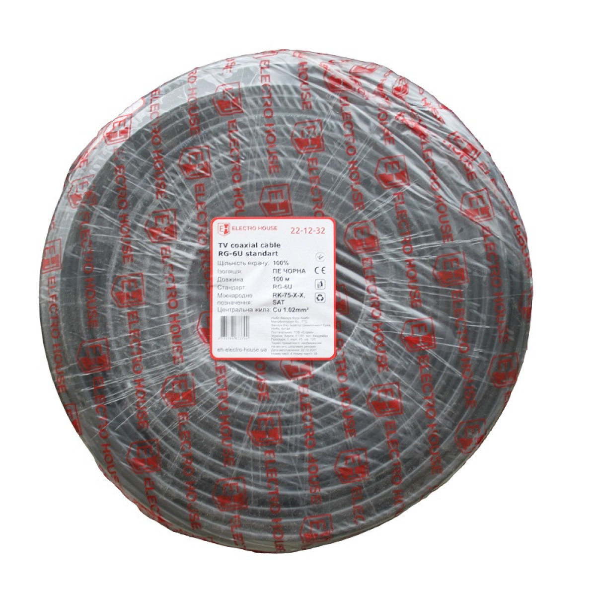 Кабель коаксіальний RG-6U 100% мідь 1.02 поліетилен, чорний, 100 м від ElectroHouse — чудовий вибір для побутового або професійного використання, що забезпечує чіткість сигналу та простоту у використанні.