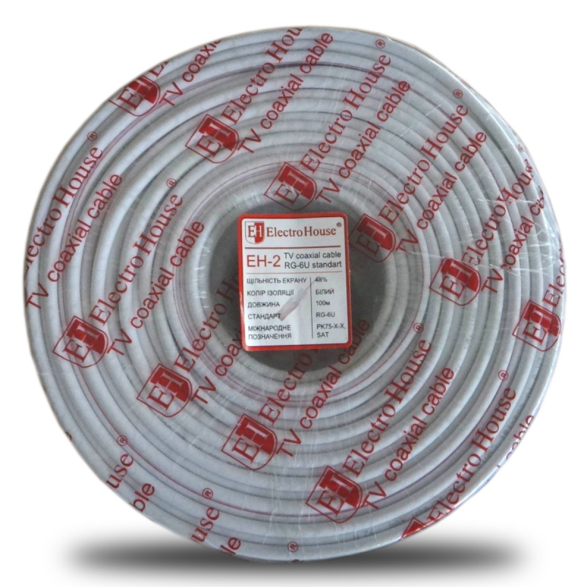 Кабель коаксіальний RG-6U 48% обміднена сталь 1.02 ПВХ, білий, 100 м від ElectroHouse — чудовий вибір для побутового або професійного використання, що забезпечує чіткість сигналу та простоту у використанні.